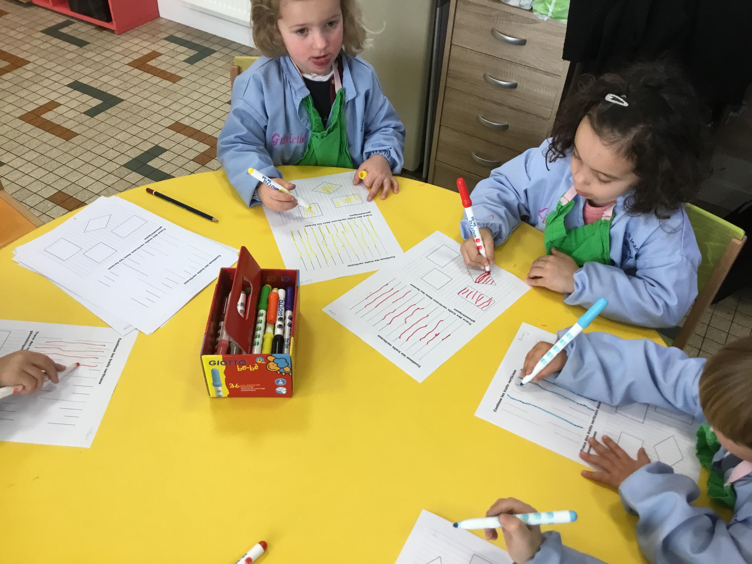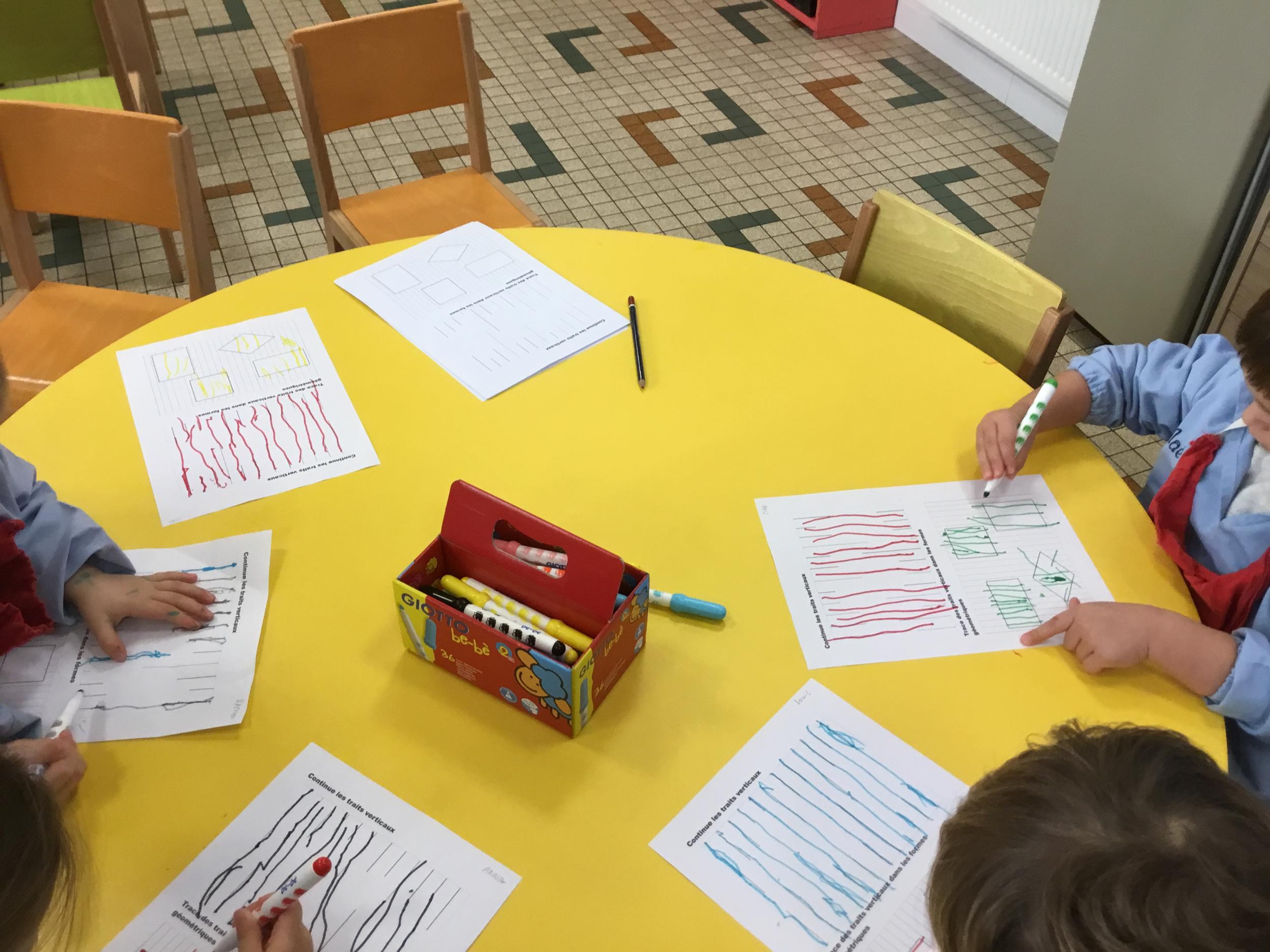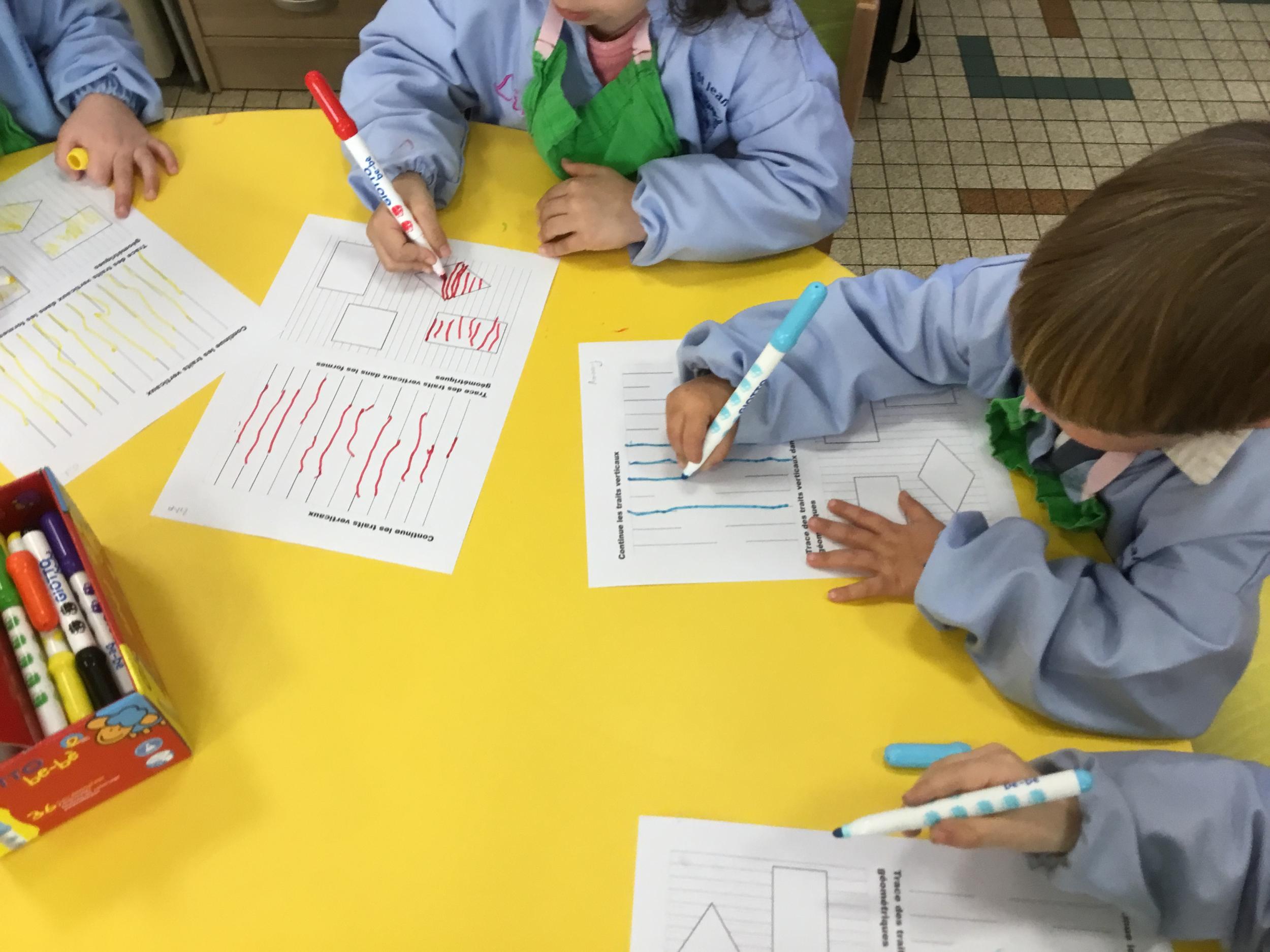 Puis, en petits groupe, les élèves ont continué à travailler autour du trait vertical en graphisme et en arts plastiques.