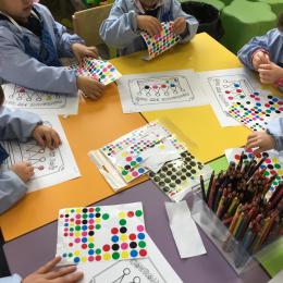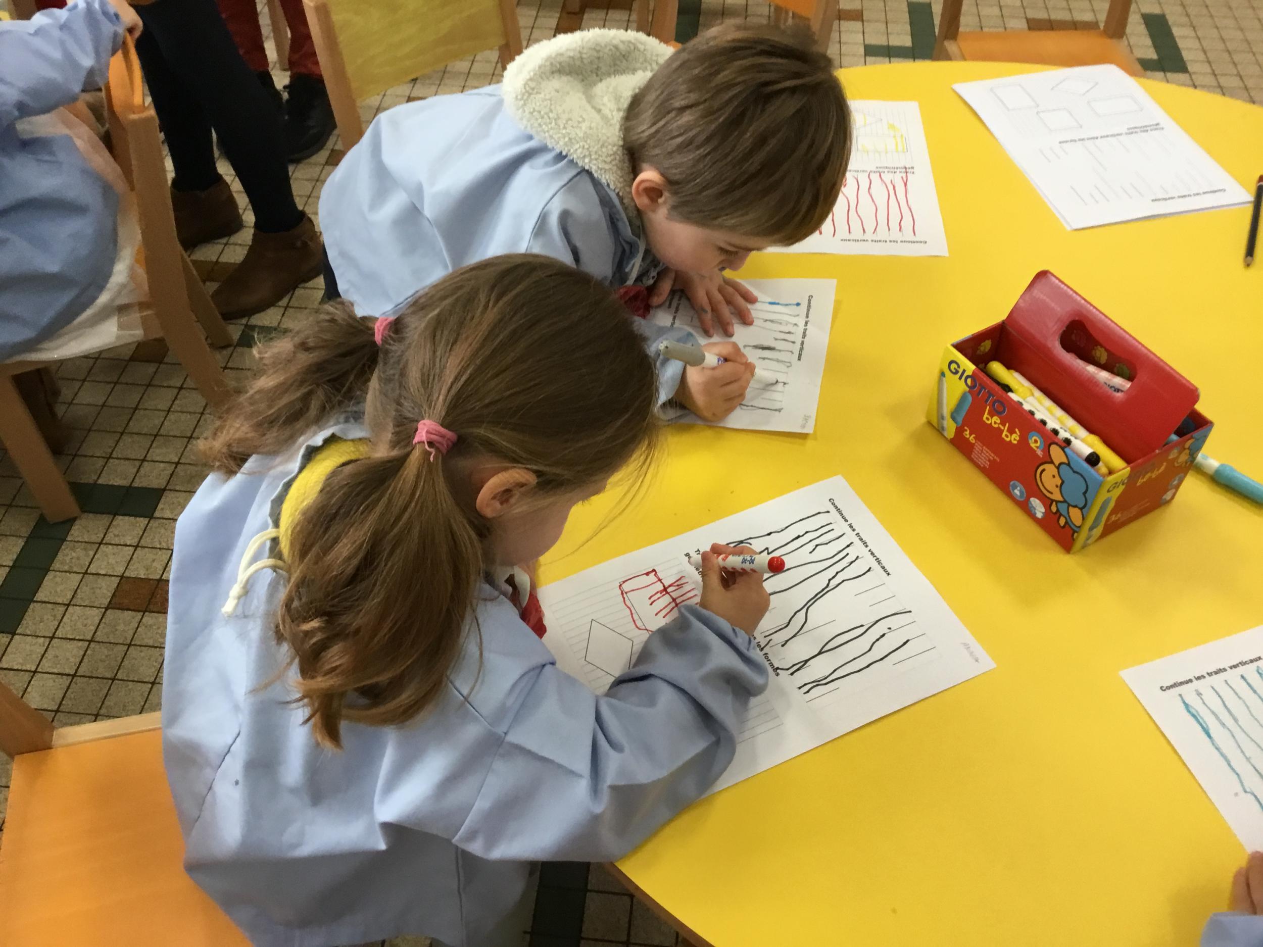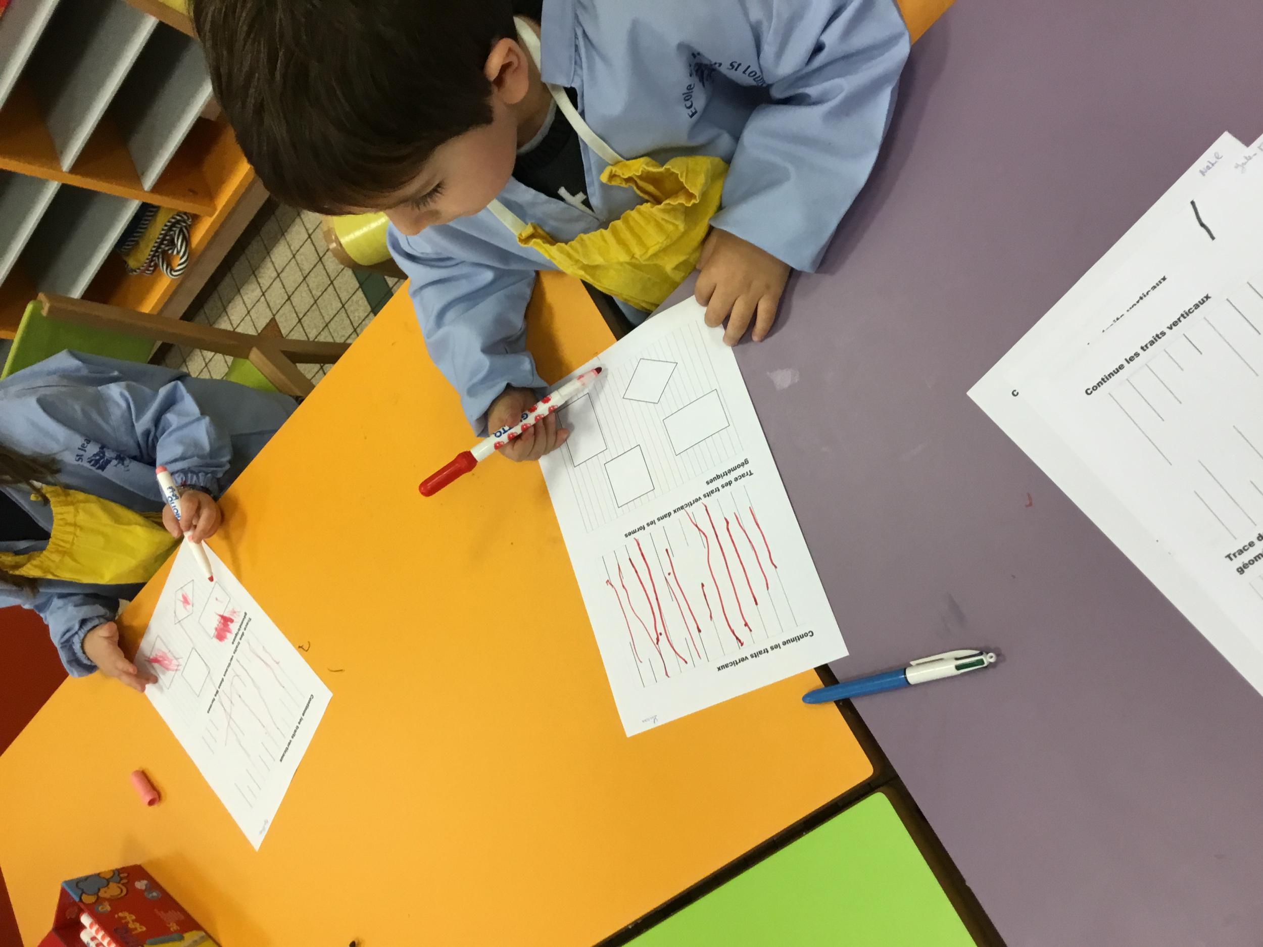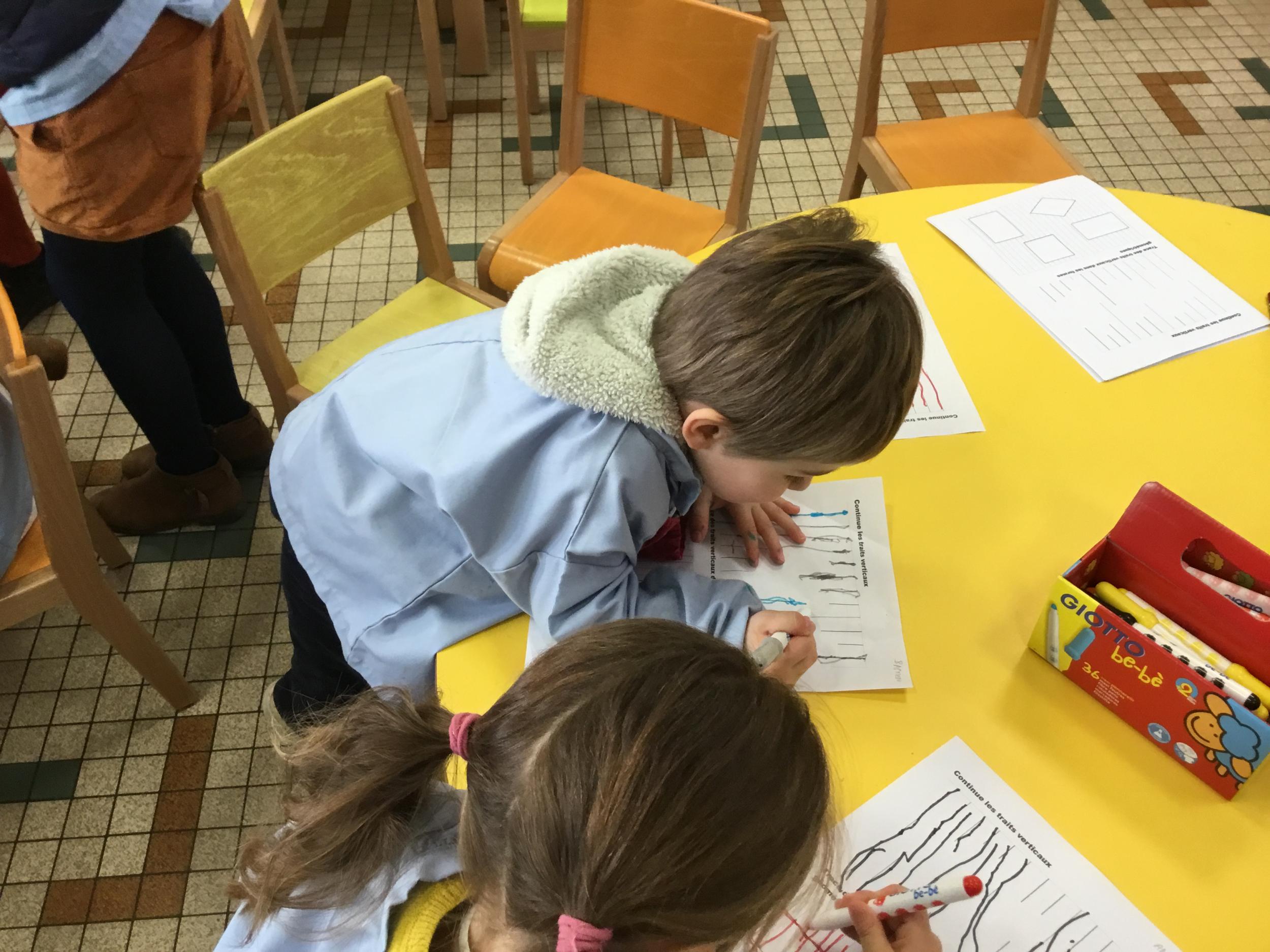 Puis, en petits groupe, les élèves ont continué à travailler autour du trait vertical en graphisme et en arts plastiques.