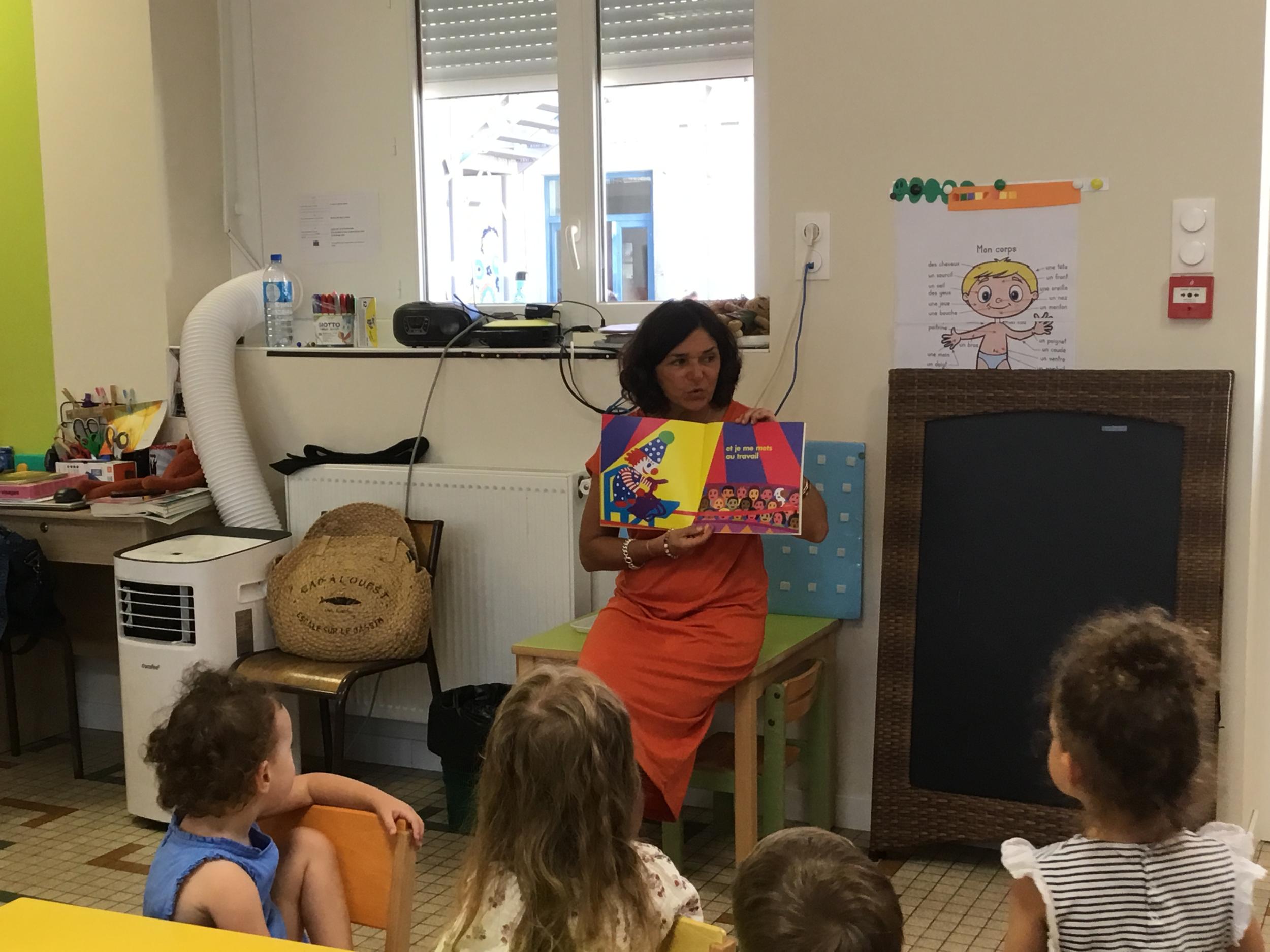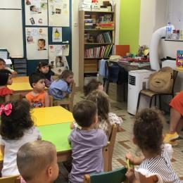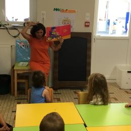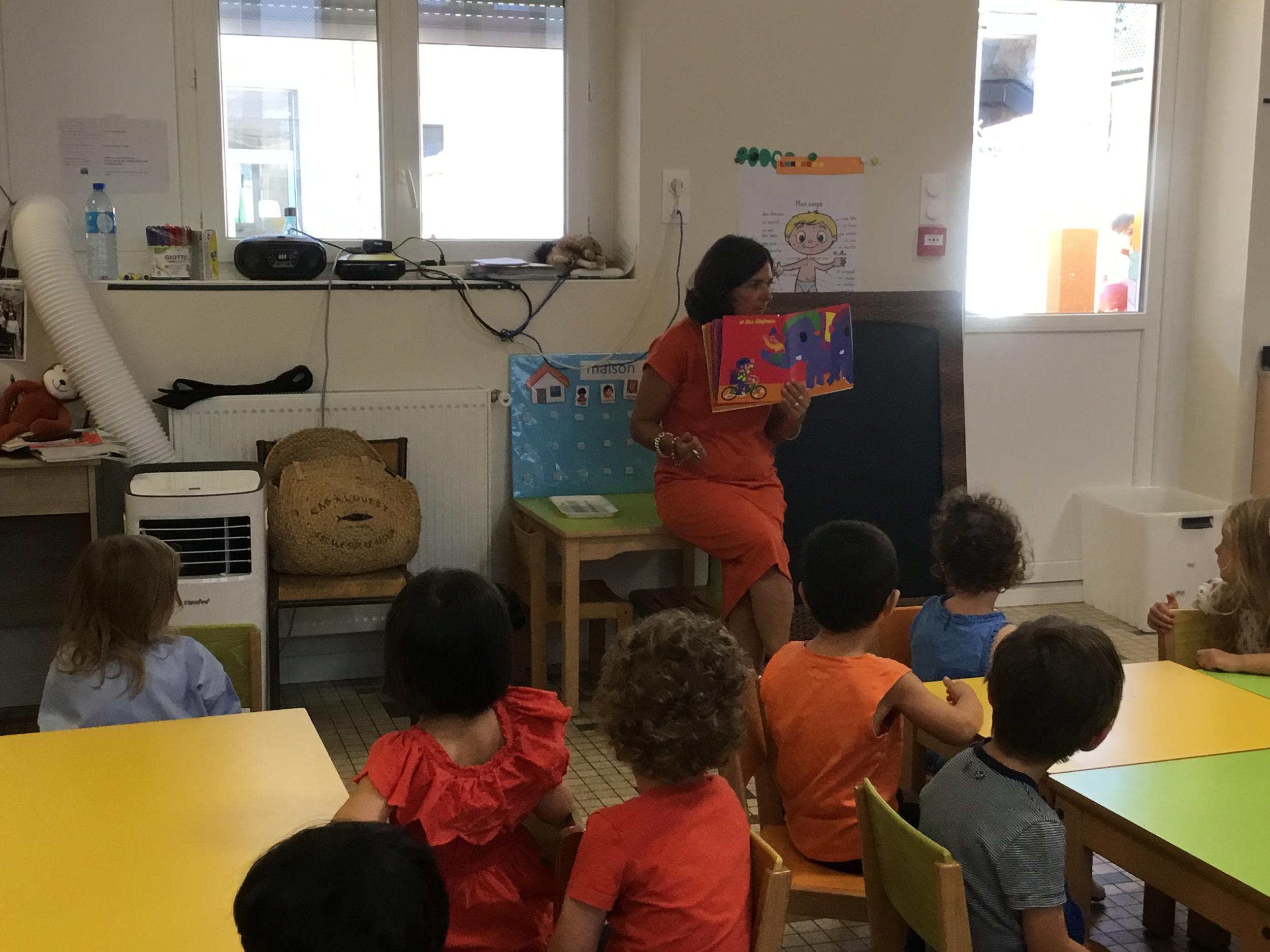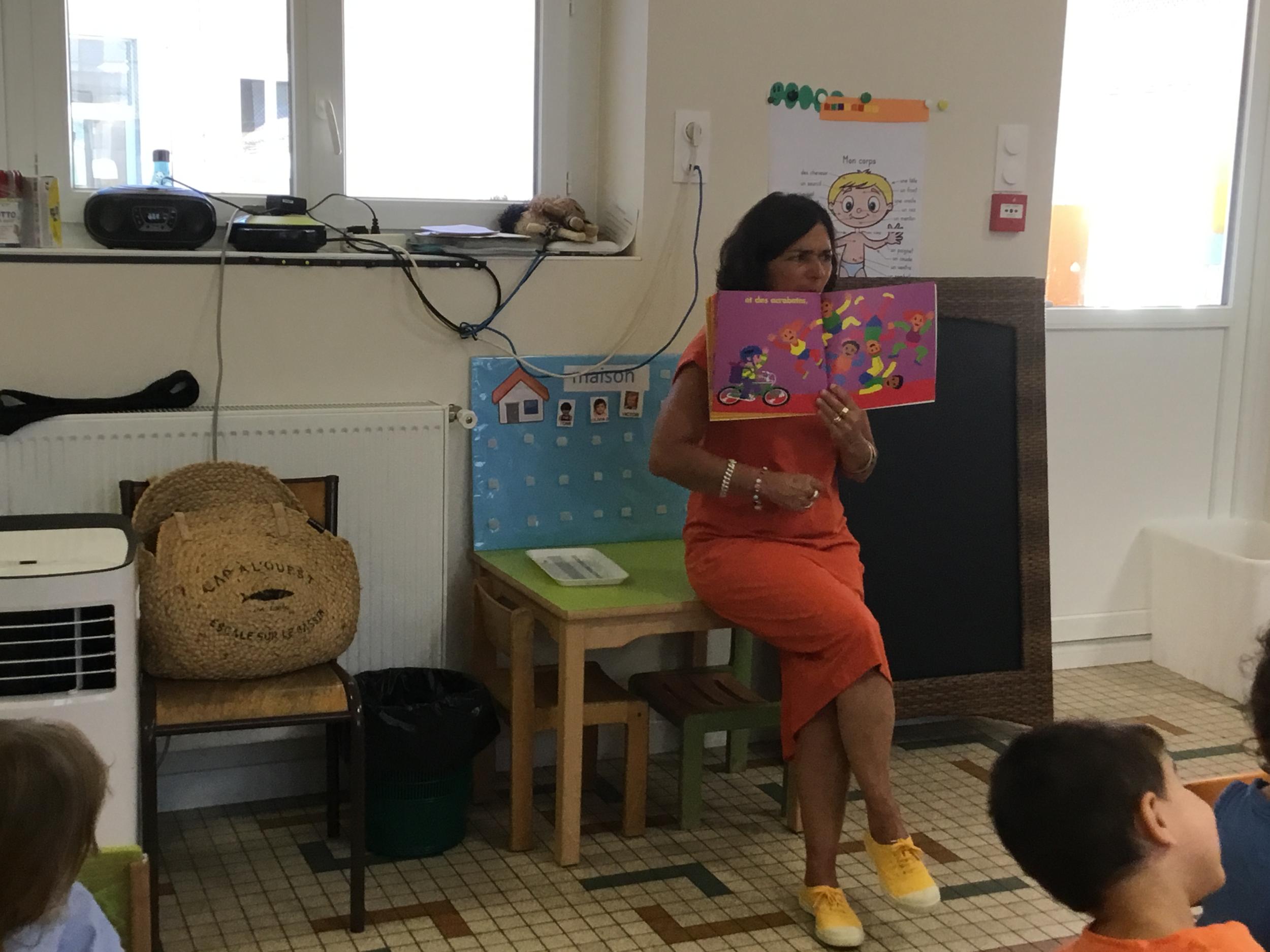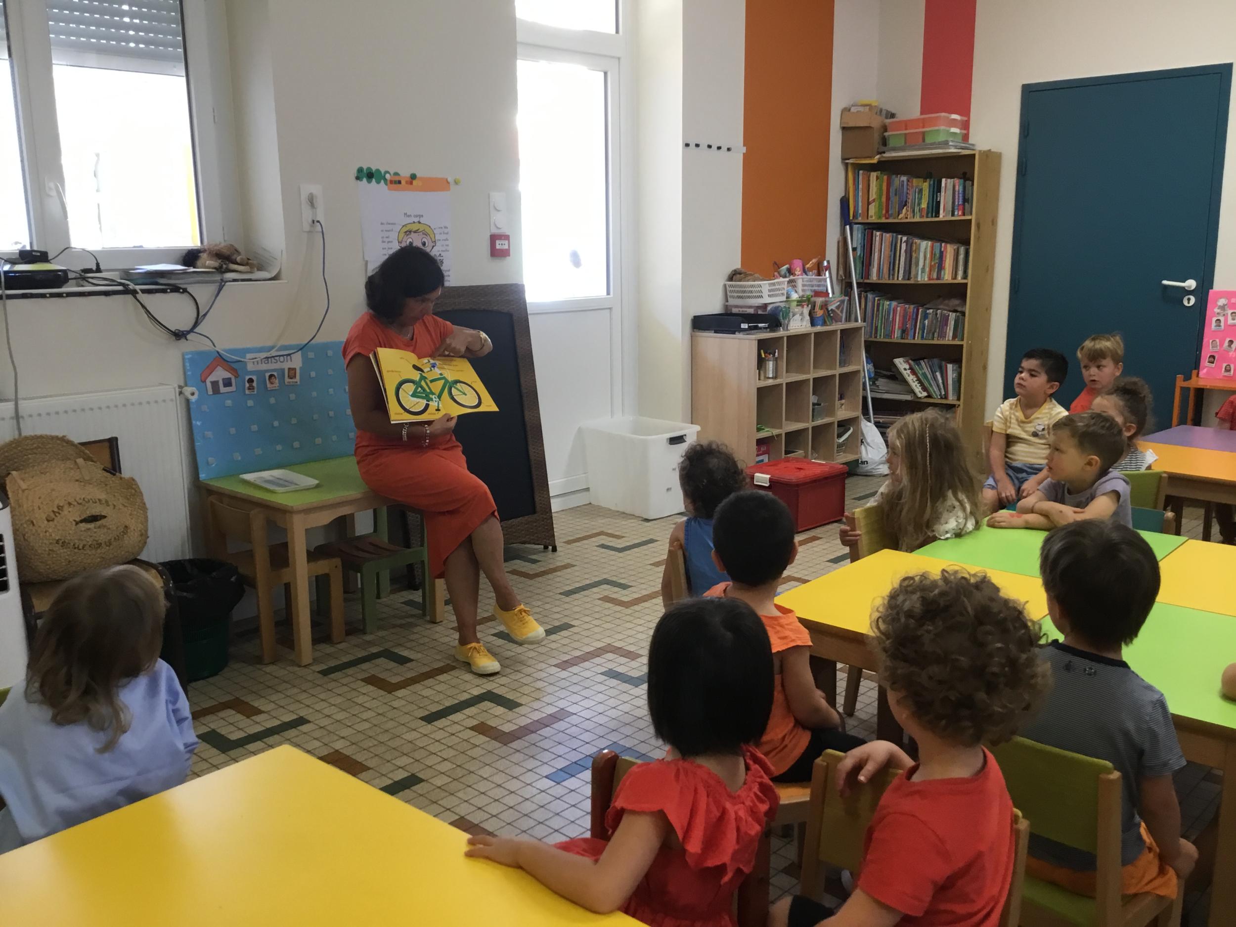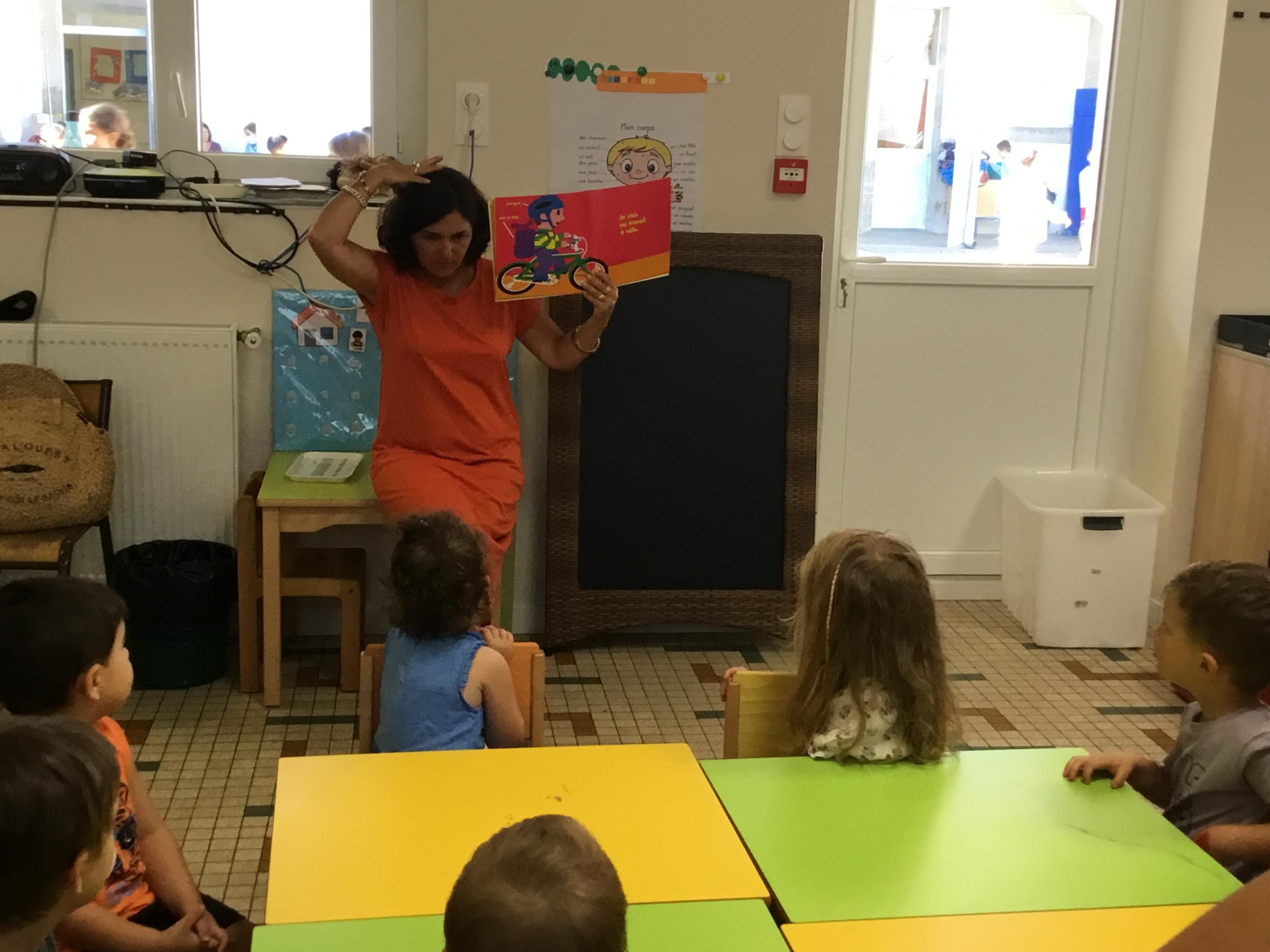 Les enfants ont écouté l’histoire de Tom … Ils ont tous été très attentifs. Les illustrations de l’album nous ont permis de repérer certaines formes mais surtout de faire des hypothèses… car Tom va travailler en vélo dans un lieu où il y a des singes, des acrobates, des éléphants….