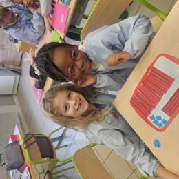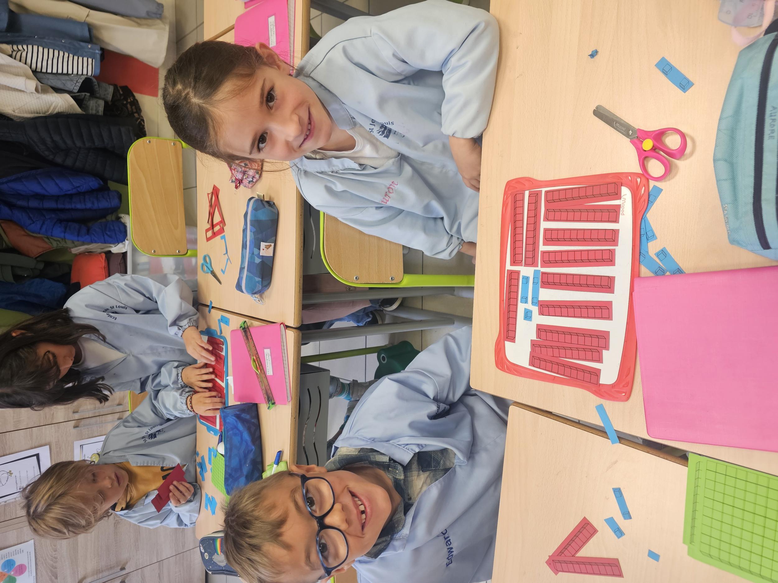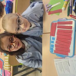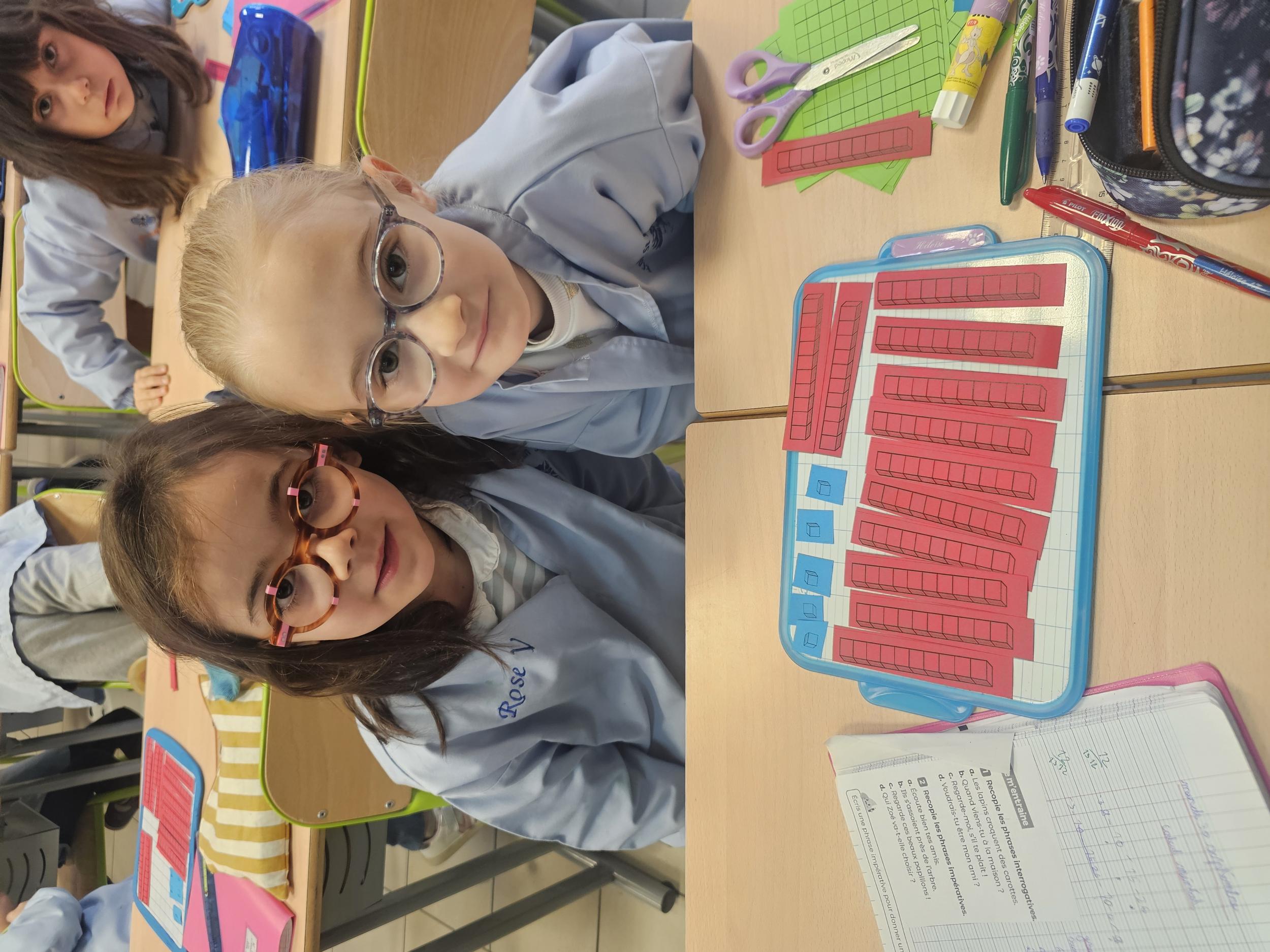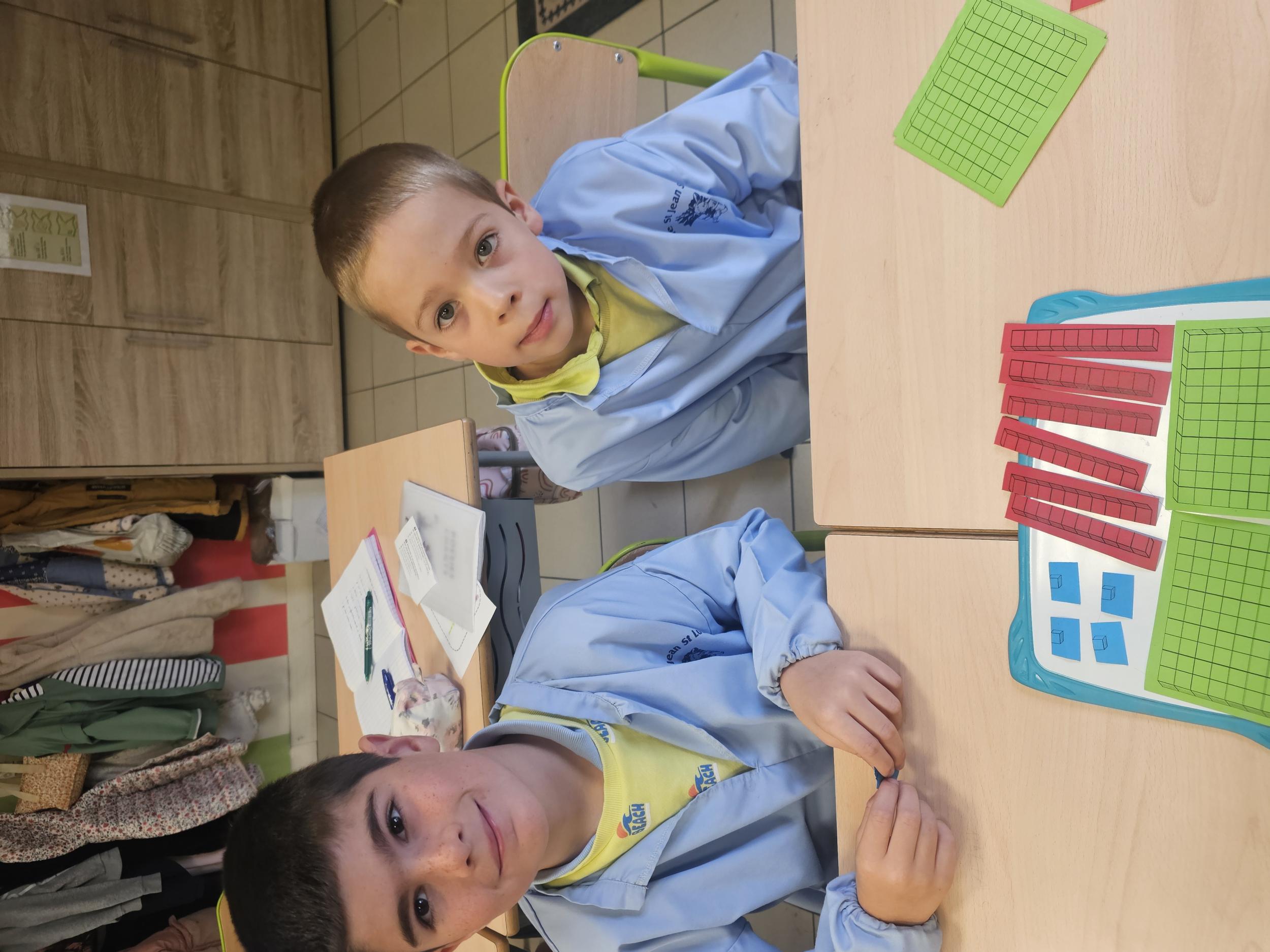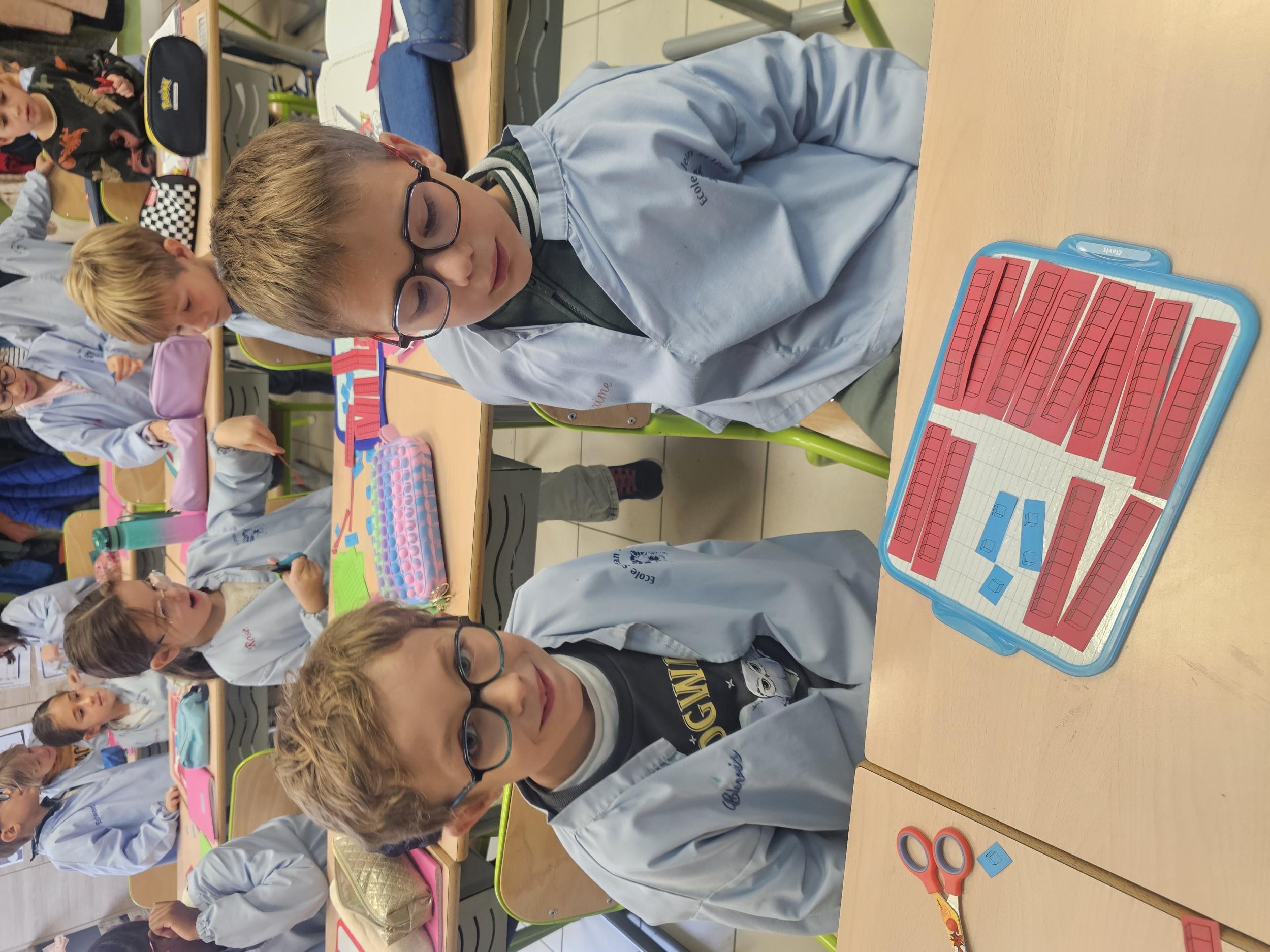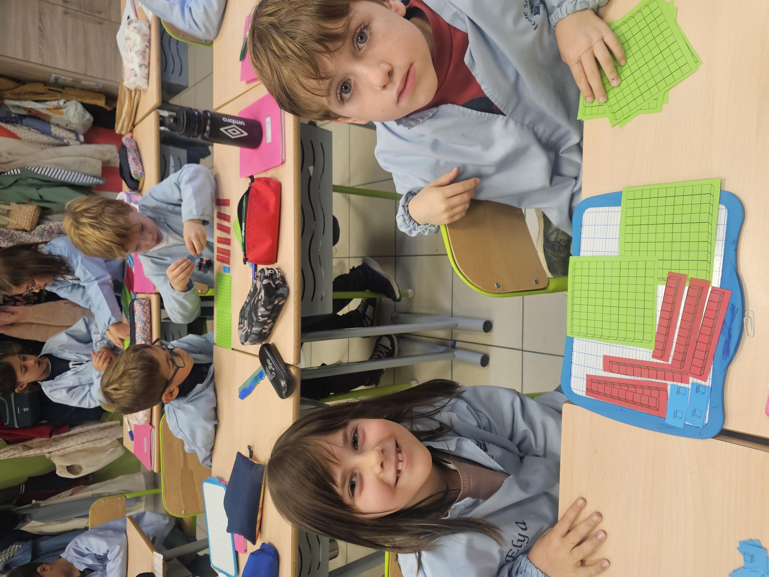En CP, les élèves ont vu les nombres jusqu'à 100. Durant la première période de CE1 nous avons revu ces notions mais nous sommes rapidement allés au delà mais en passant beaucoup par la manipulation. Pour que l'abstraction soit possible en mathématiques il faut que l'enfant se représente le nombre de différentes manières. Ici l'unité est le cube bleu, la dizaine est une barre rouge (assemblage de 10 cubes) et la centaine est un carré vert (assemblage de 100 cubes). L'enseignante écrit un nombre au tableau, les élèves le représentent à l'aide du matériel. Le travail en binôme favorise les échanges, l'entraide et la réflexion collective.