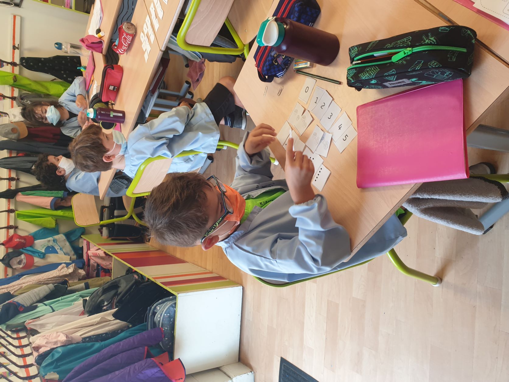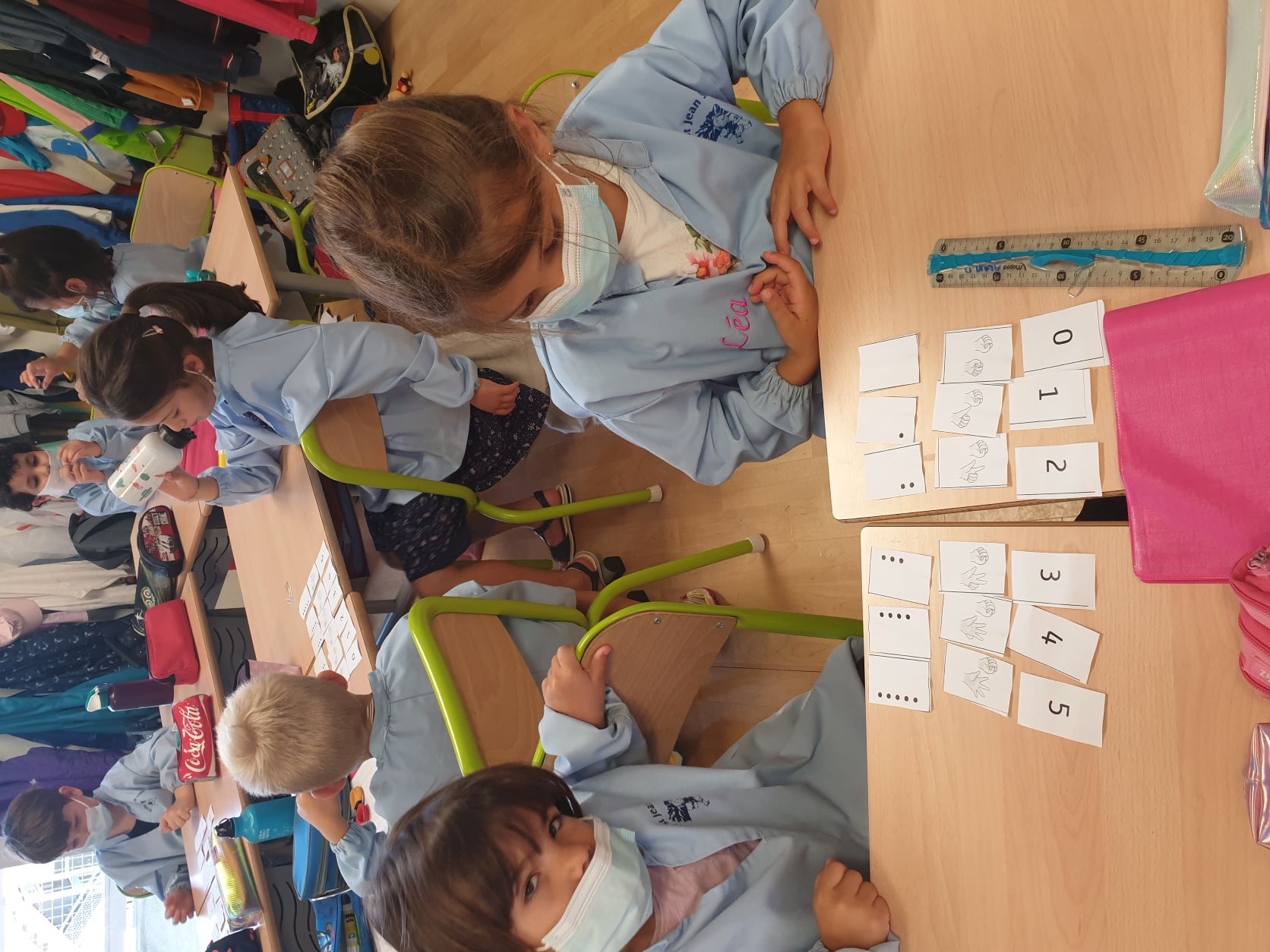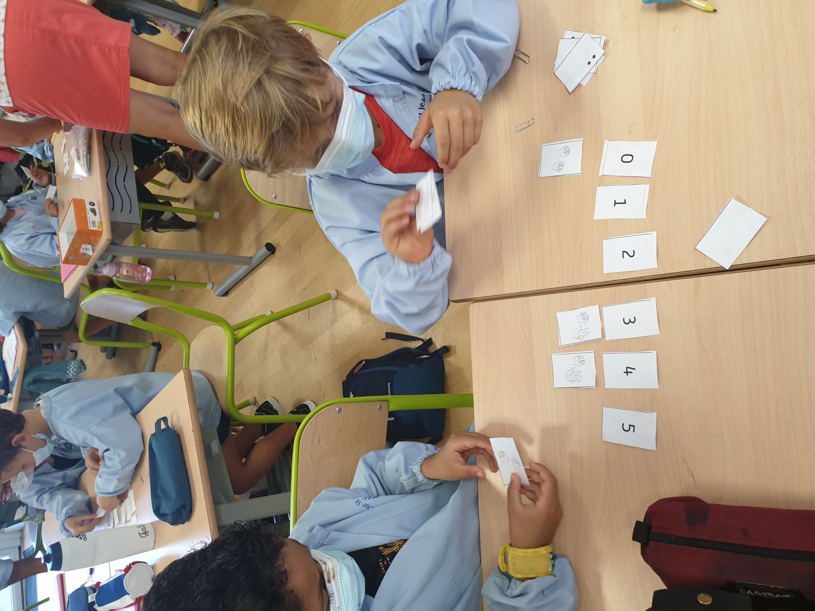 Aujourd'hui c'est notre 9ème jour d'école et nous avons fait une séance de mathématiques. Nous avons remis des étiquettes avec les nombres de 0 à 5 dans l'ordre. C'était pas très facile pour tout le monde, il y a des élèves qui les avaient rangé dans le désordre. Puis nous avons mis les étiquettes avec les doigts sous les bons nombres et enfin nous avons mis au bon endroit les étiquettes avec les points. Nous avons travaillé par deux, c'était chouette mais un peu dur de travailler à deux.