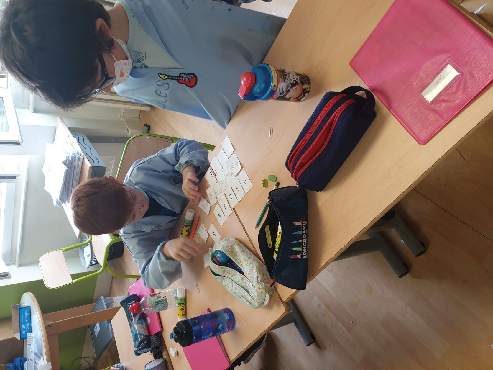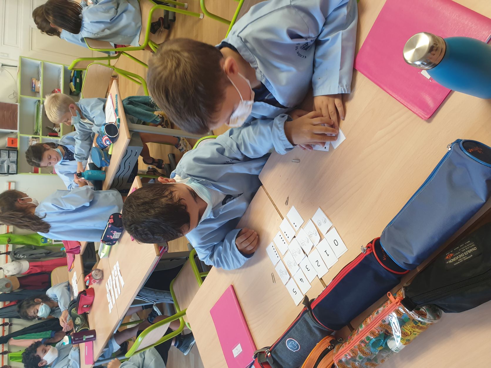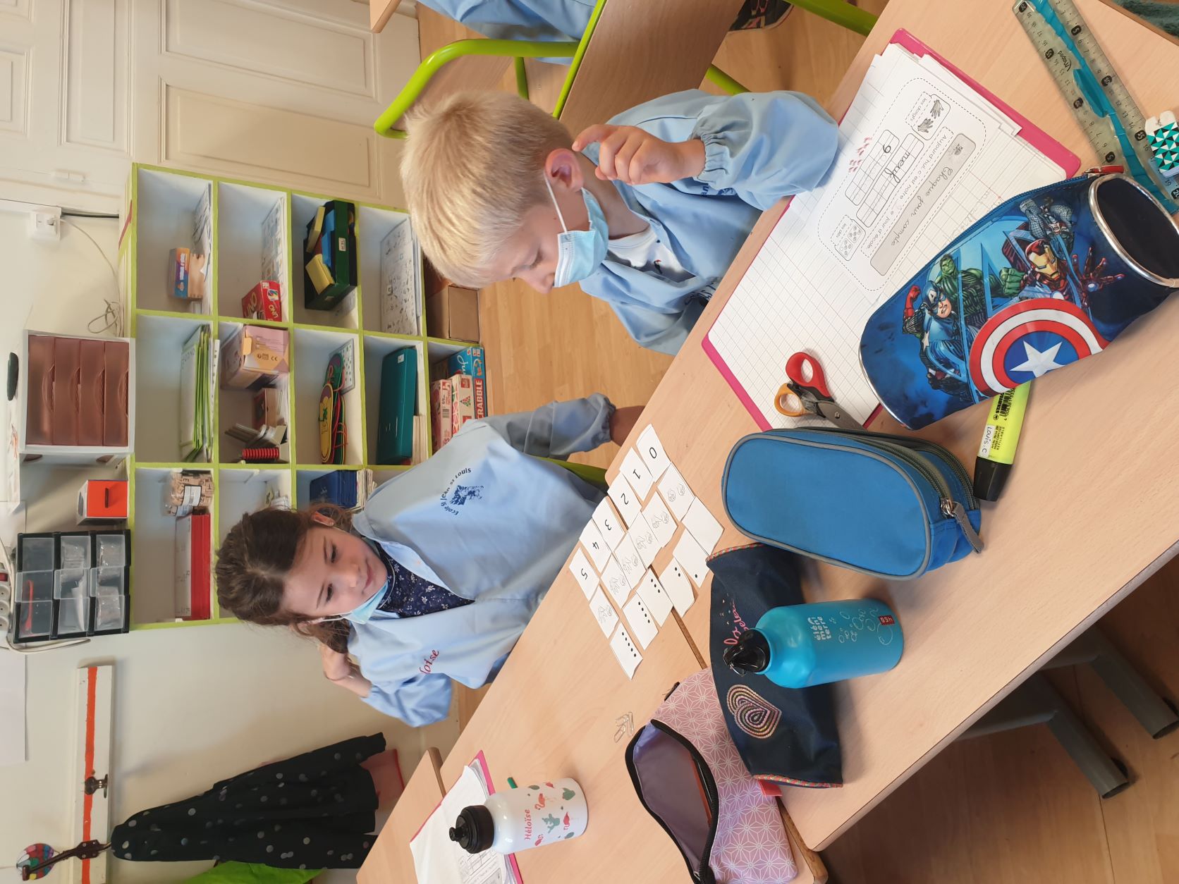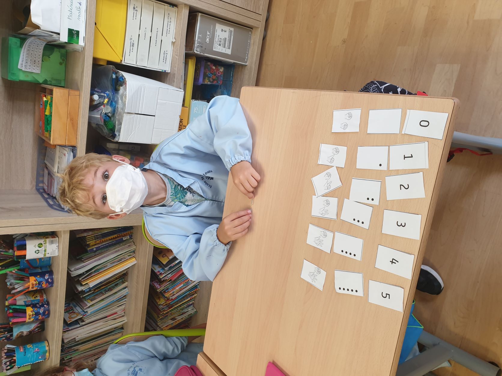 Aujourd'hui c'est notre 9ème jour d'école et nous avons fait une séance de mathématiques. Nous avons remis des étiquettes avec les nombres de 0 à 5 dans l'ordre. C'était pas très facile pour tout le monde, il y a des élèves qui les avaient rangé dans le désordre. Puis nous avons mis les étiquettes avec les doigts sous les bons nombres et enfin nous avons mis au bon endroit les étiquettes avec les points. Nous avons travaillé par deux, c'était chouette mais un peu dur de travailler à deux.