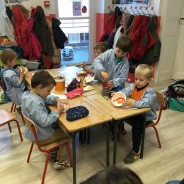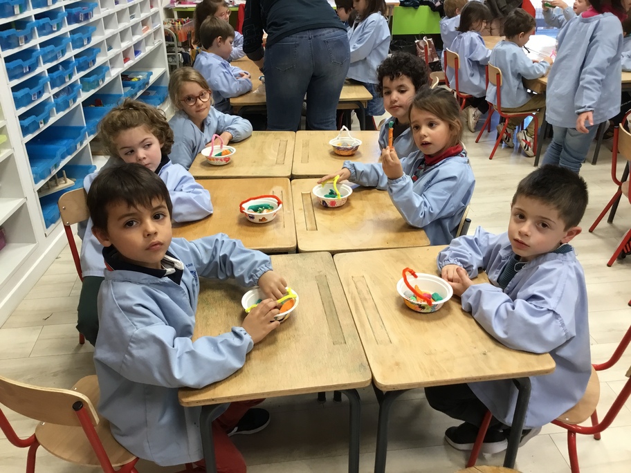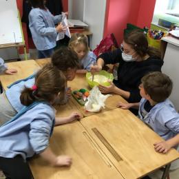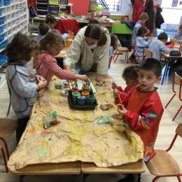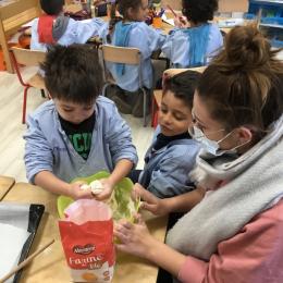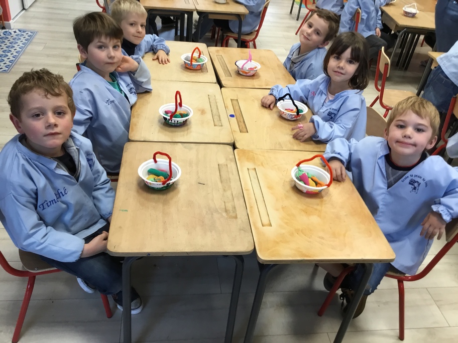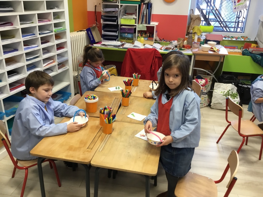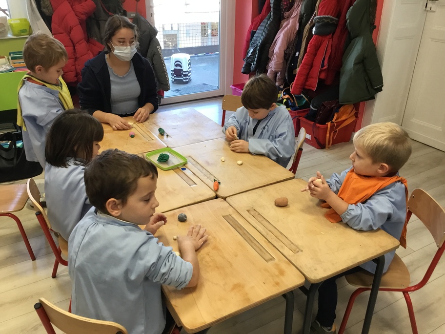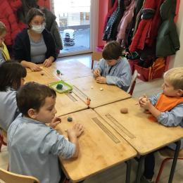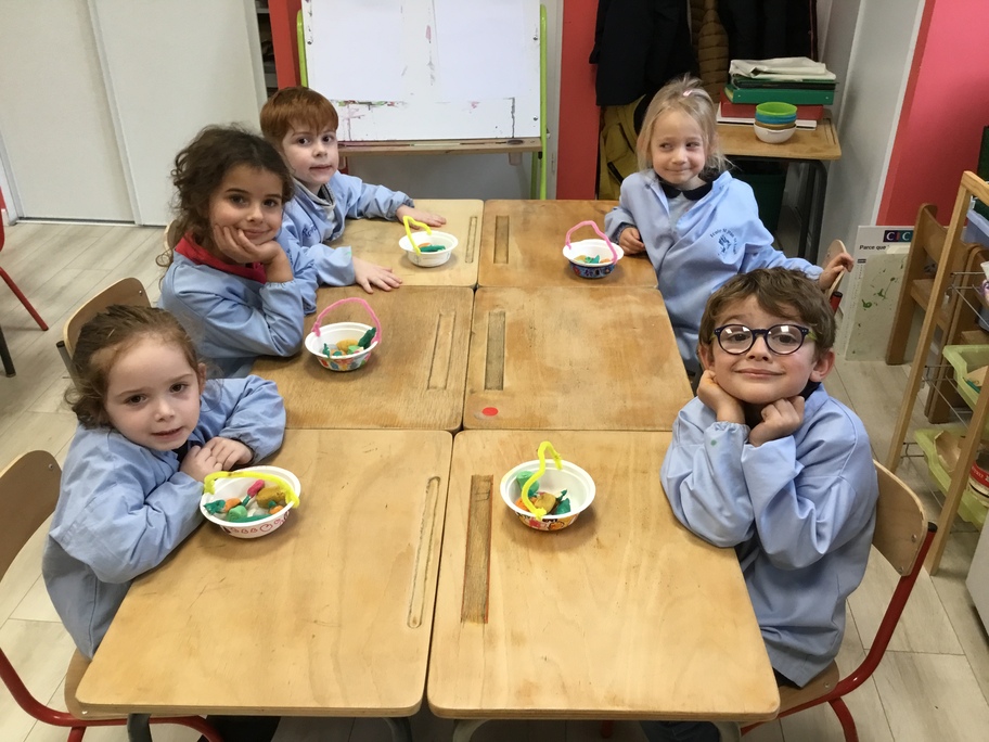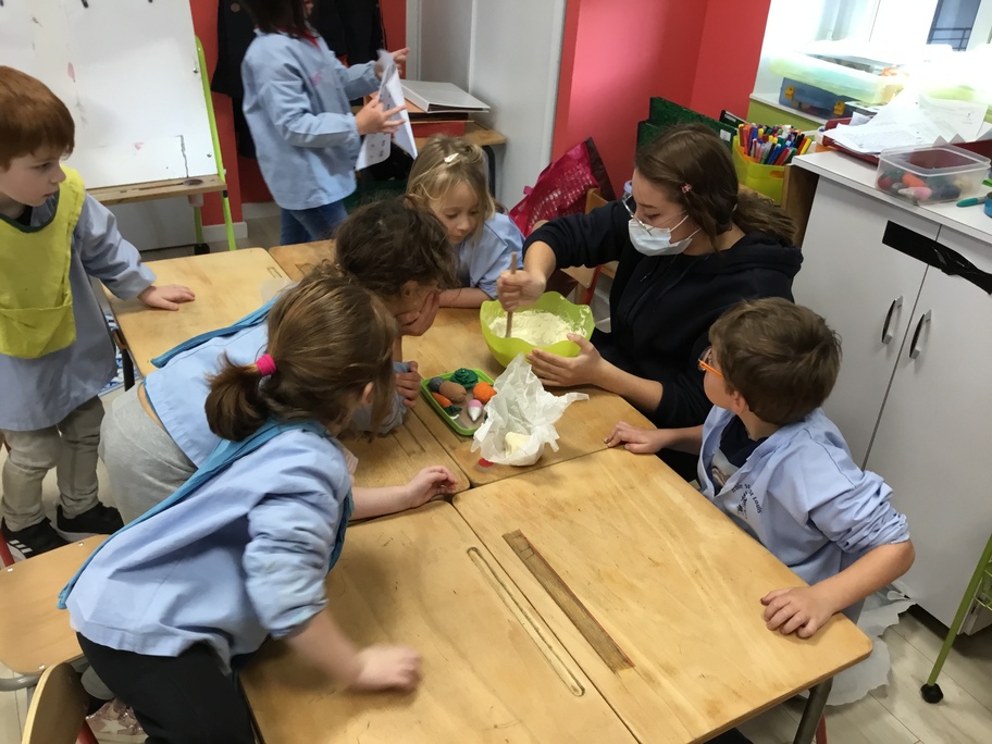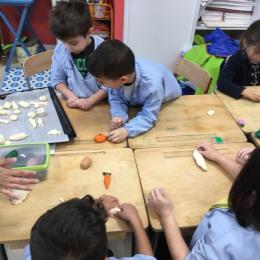 Avec Angéla, la stagiaire présente tout ce mois de novembre, les élèves ont pu prolonger leur soupe au caillou en fabriquant les légumes... et le caillou, en pâte à sel : modelage, peinture, jeux divers puis confection de petits paniers pour transporter leurs légumes...