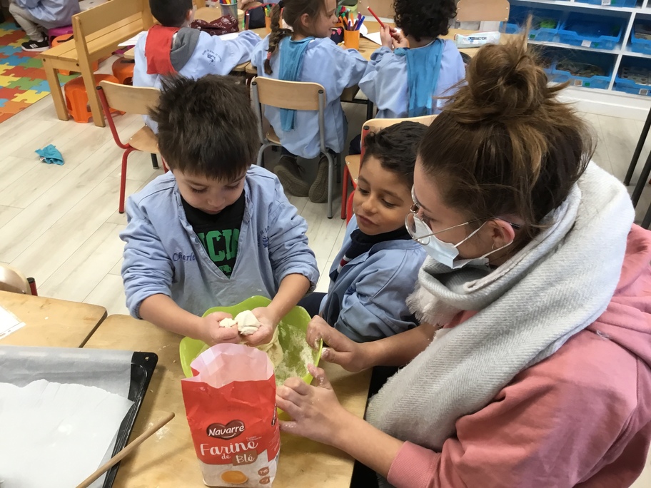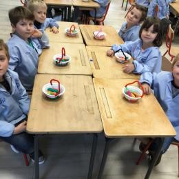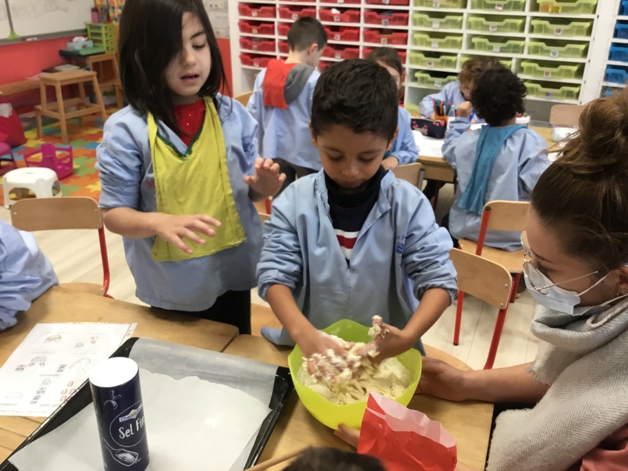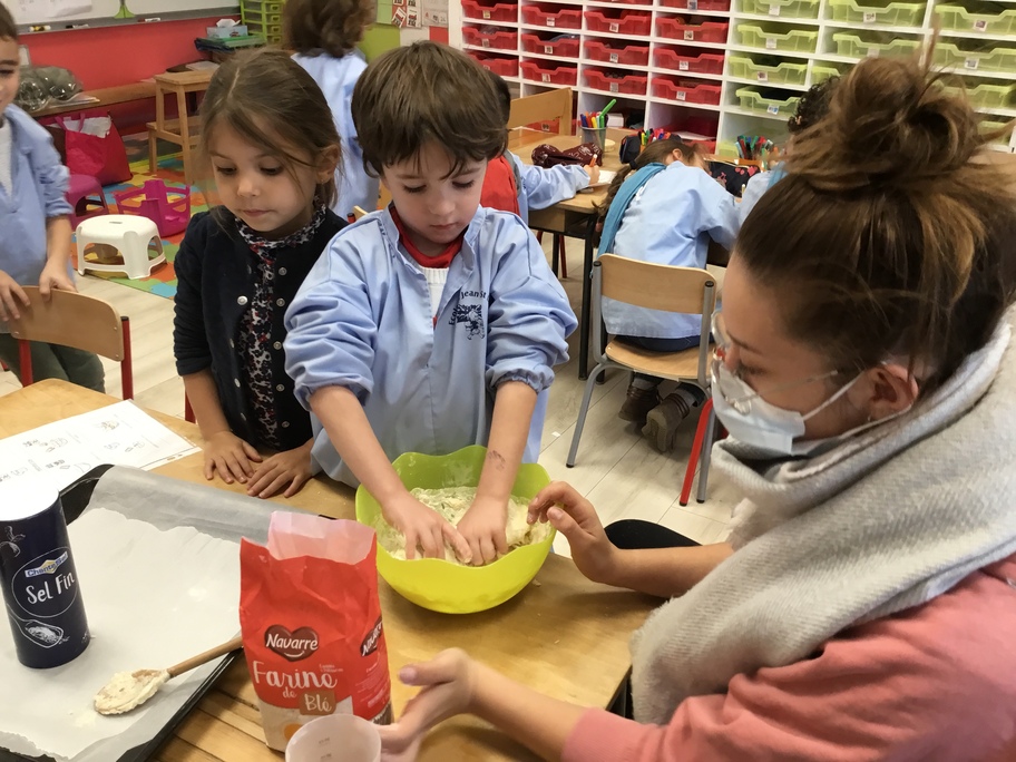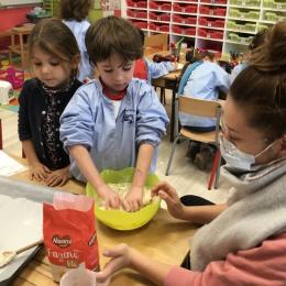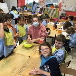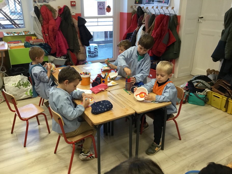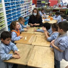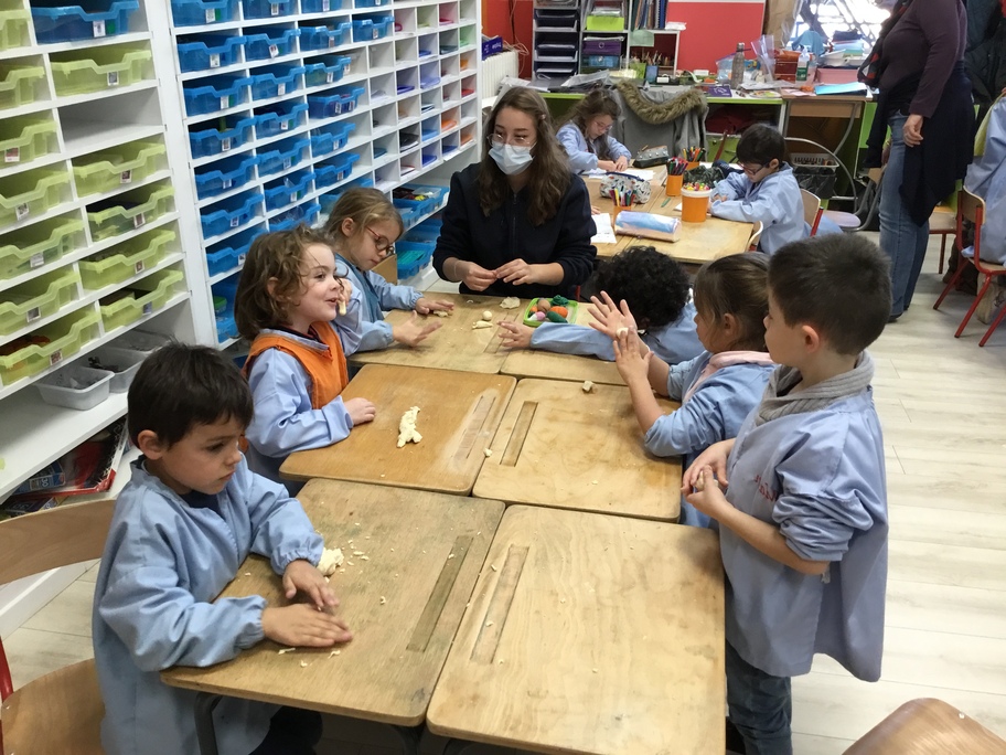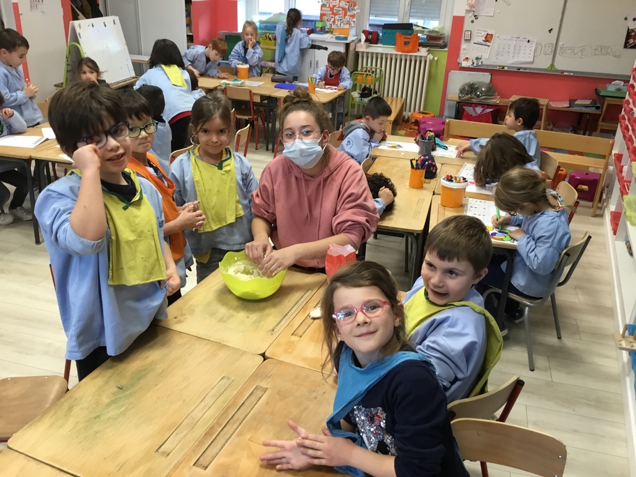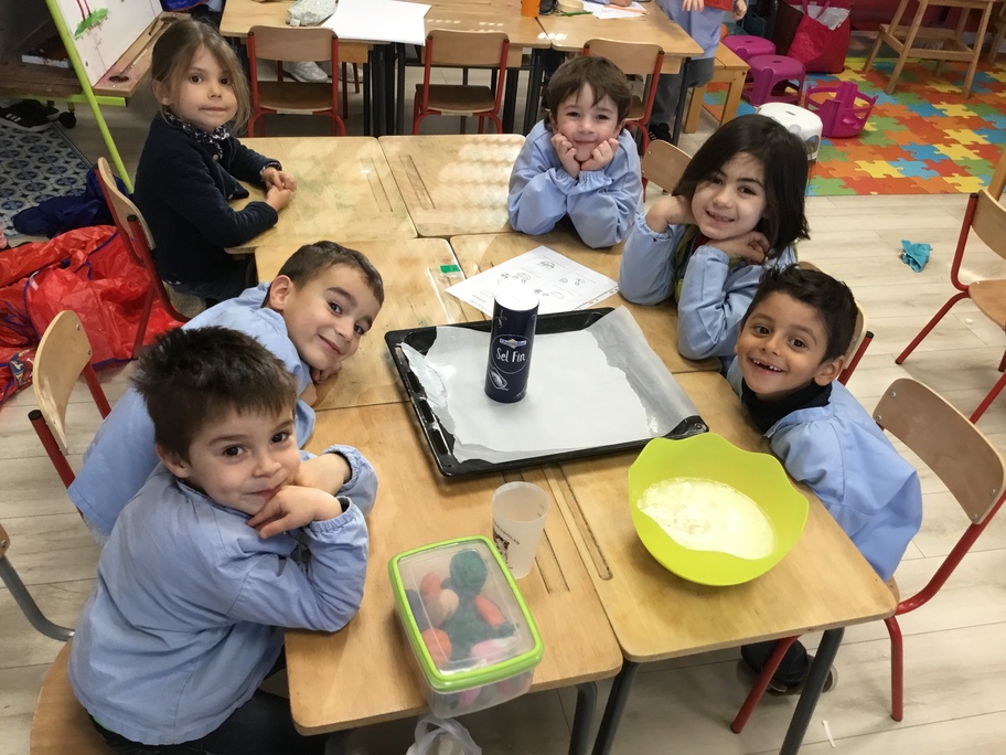 Avec Angéla, la stagiaire présente tout ce mois de novembre, les élèves ont pu prolonger leur soupe au caillou en fabriquant les légumes... et le caillou, en pâte à sel : modelage, peinture, jeux divers puis confection de petits paniers pour transporter leurs légumes...