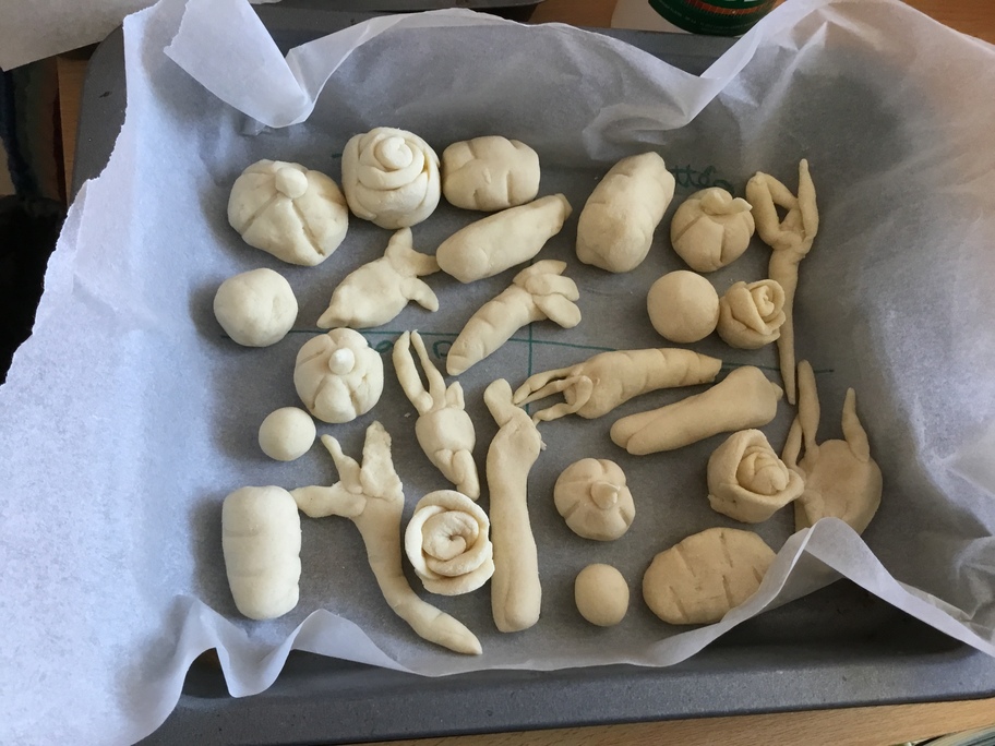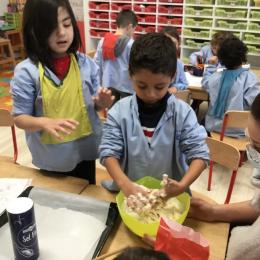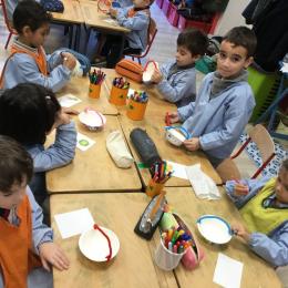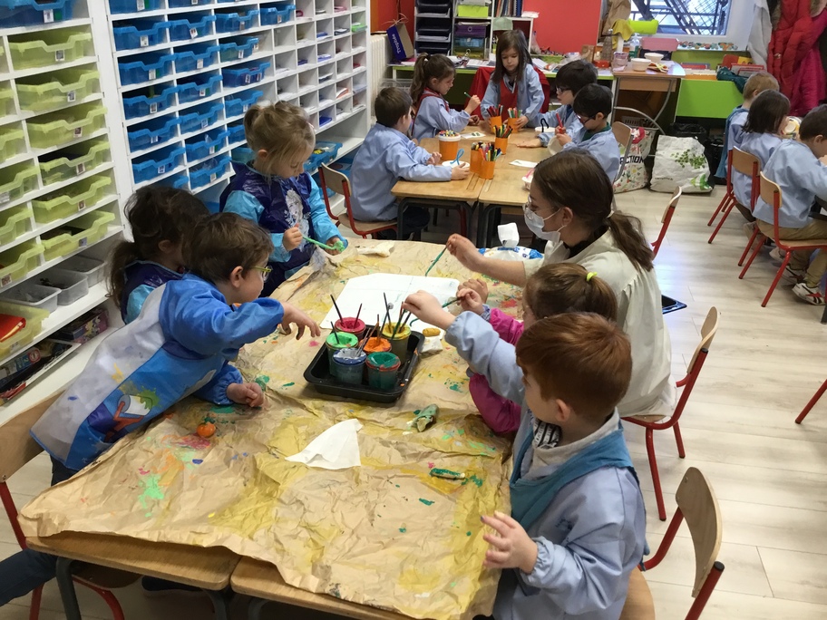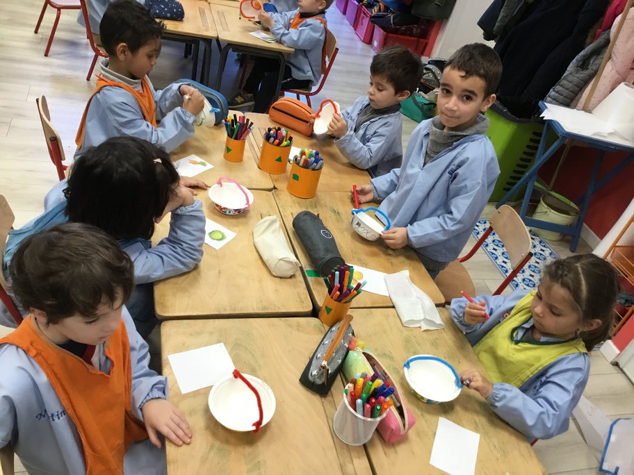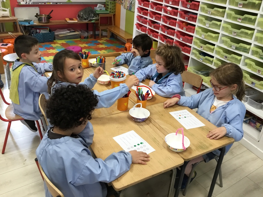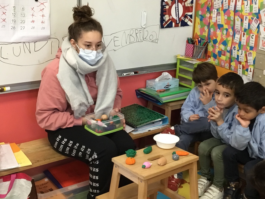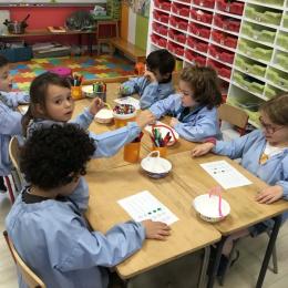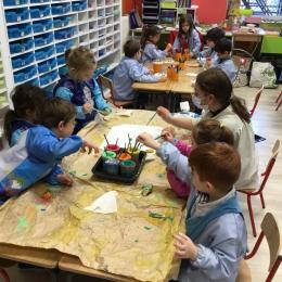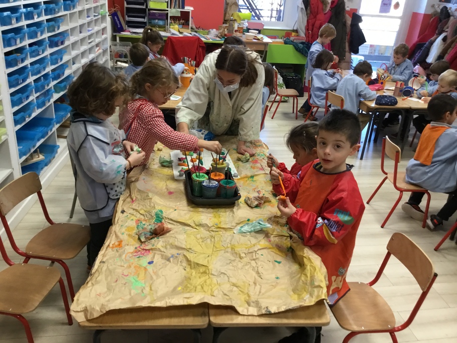 Avec Angéla, la stagiaire présente tout ce mois de novembre, les élèves ont pu prolonger leur soupe au caillou en fabriquant les légumes... et le caillou, en pâte à sel : modelage, peinture, jeux divers puis confection de petits paniers pour transporter leurs légumes...