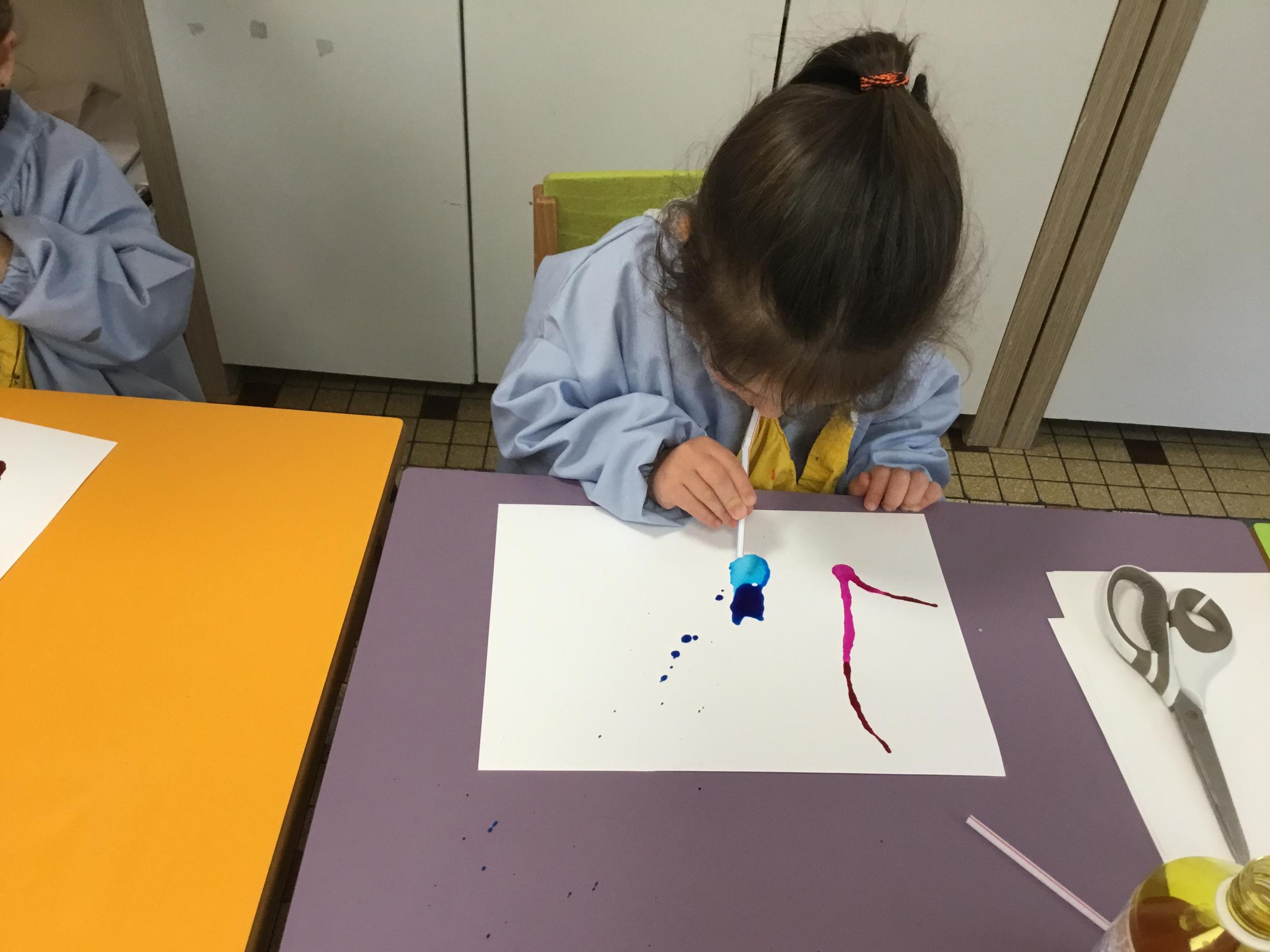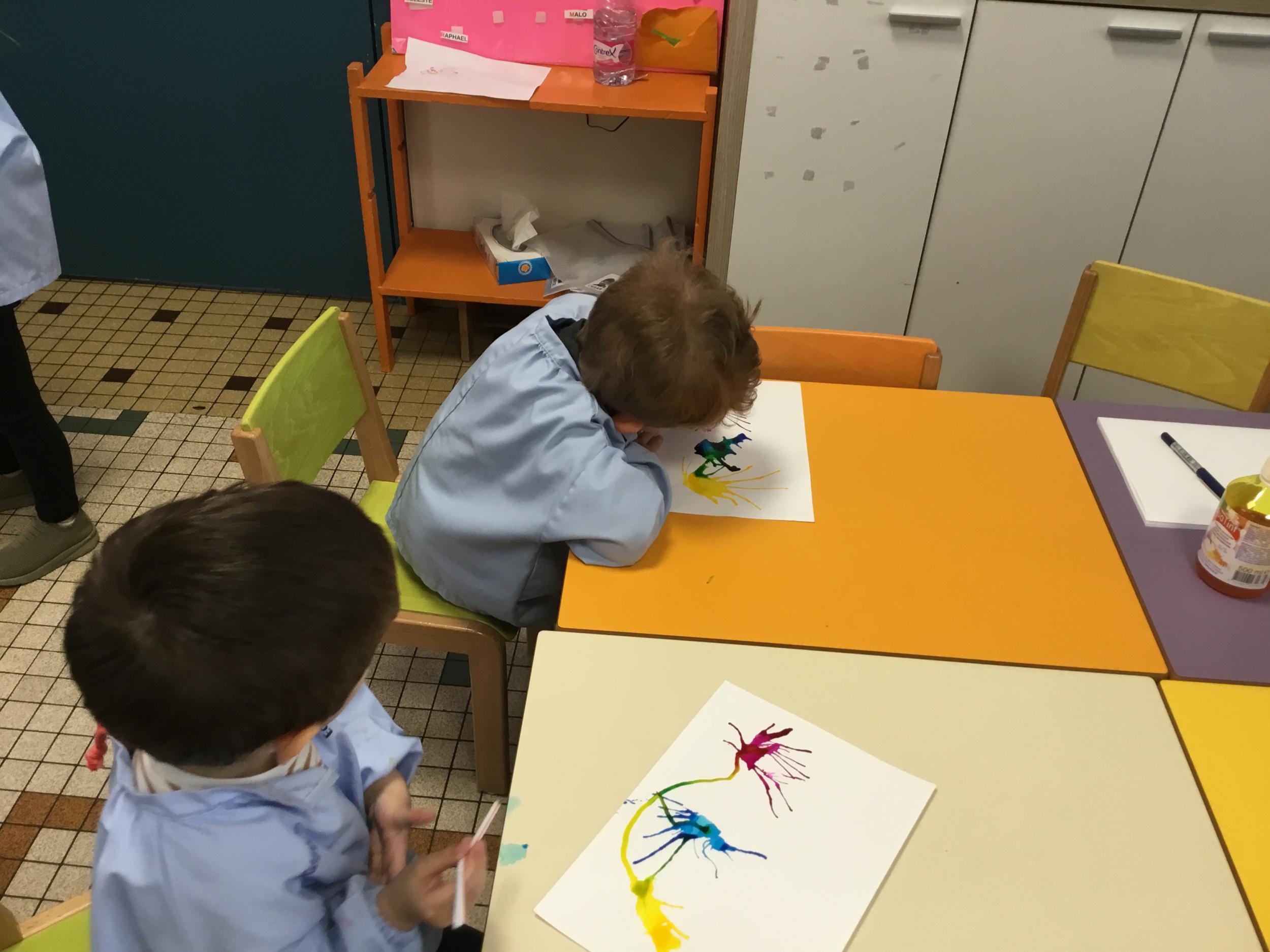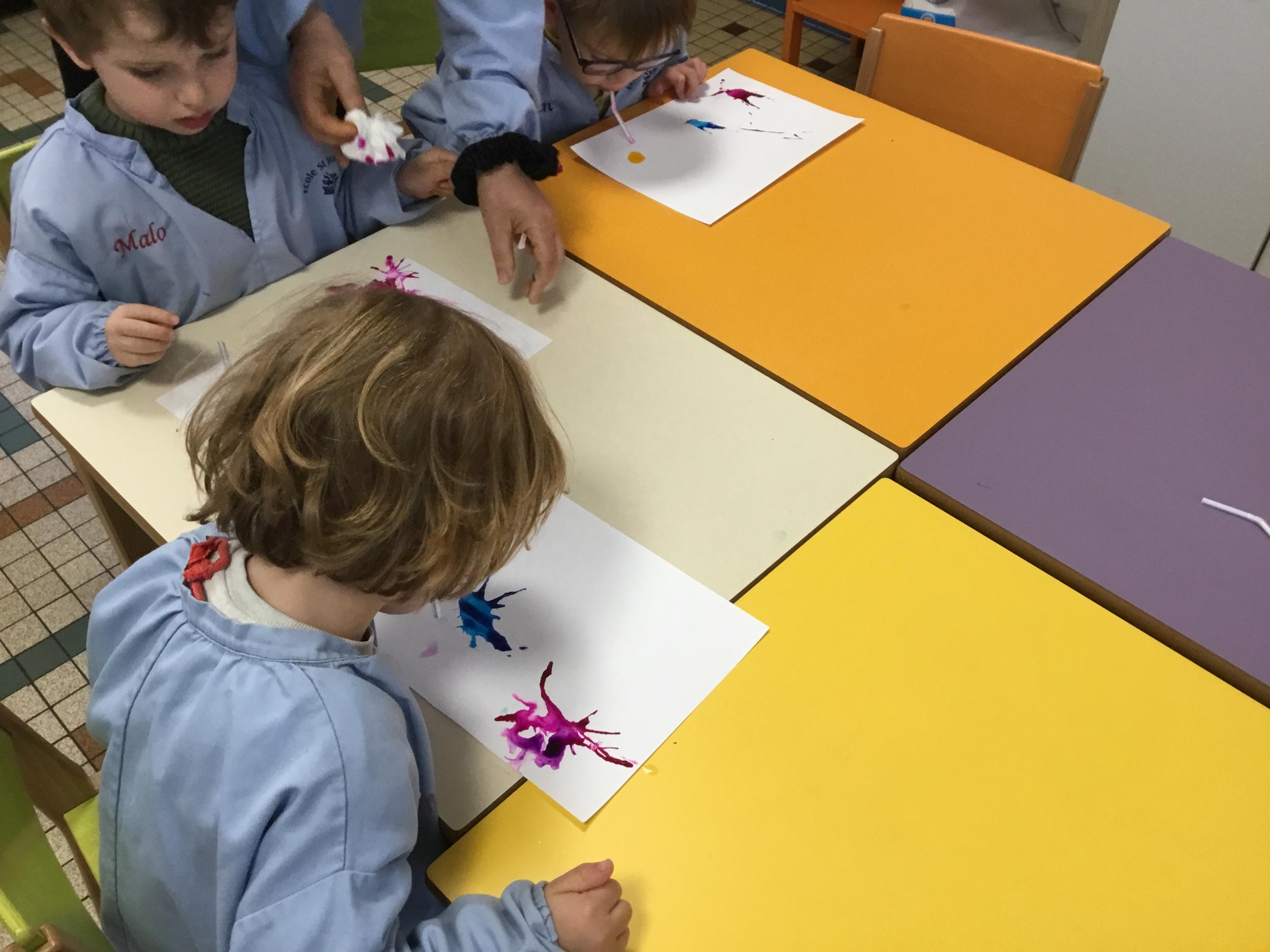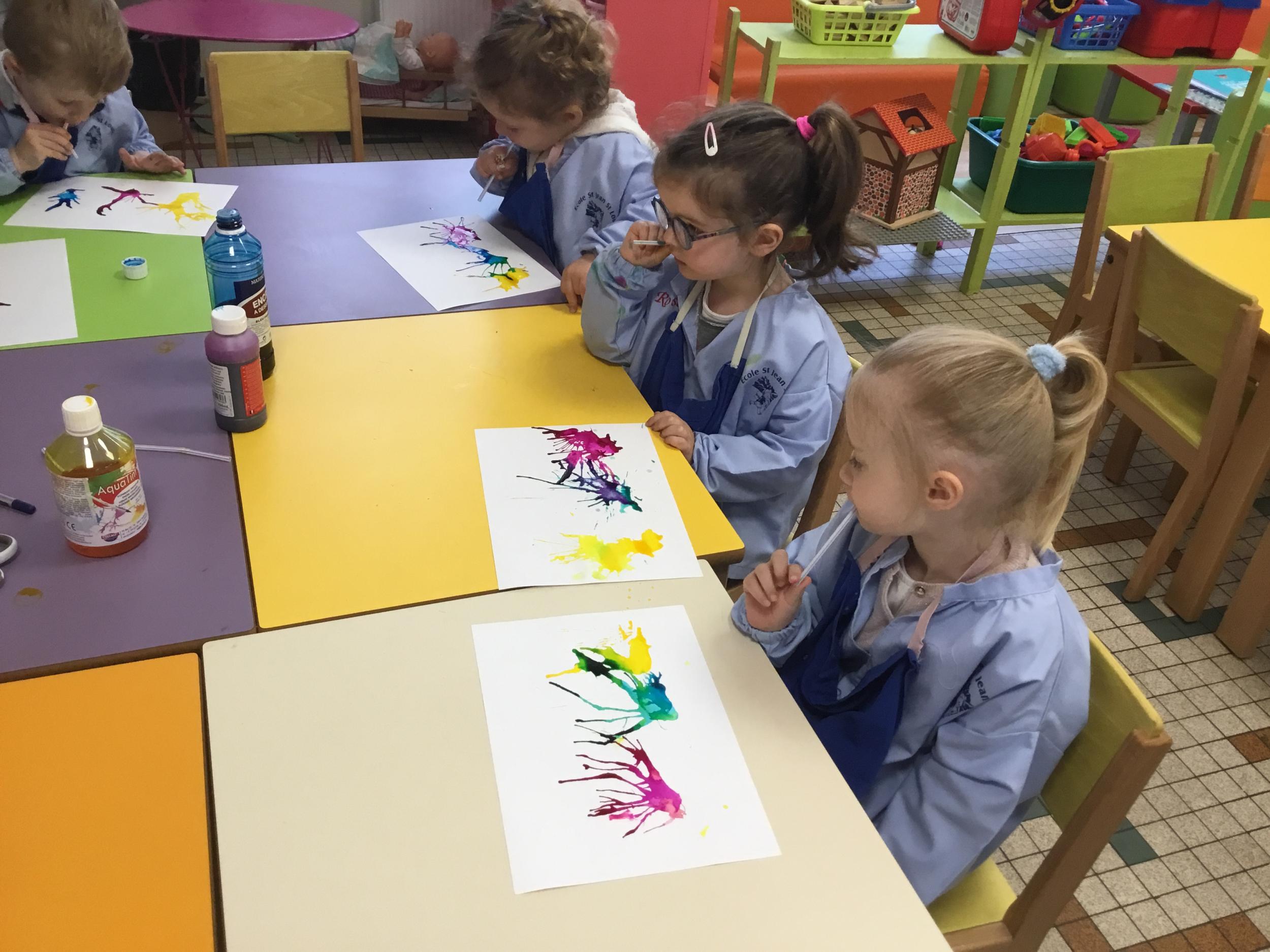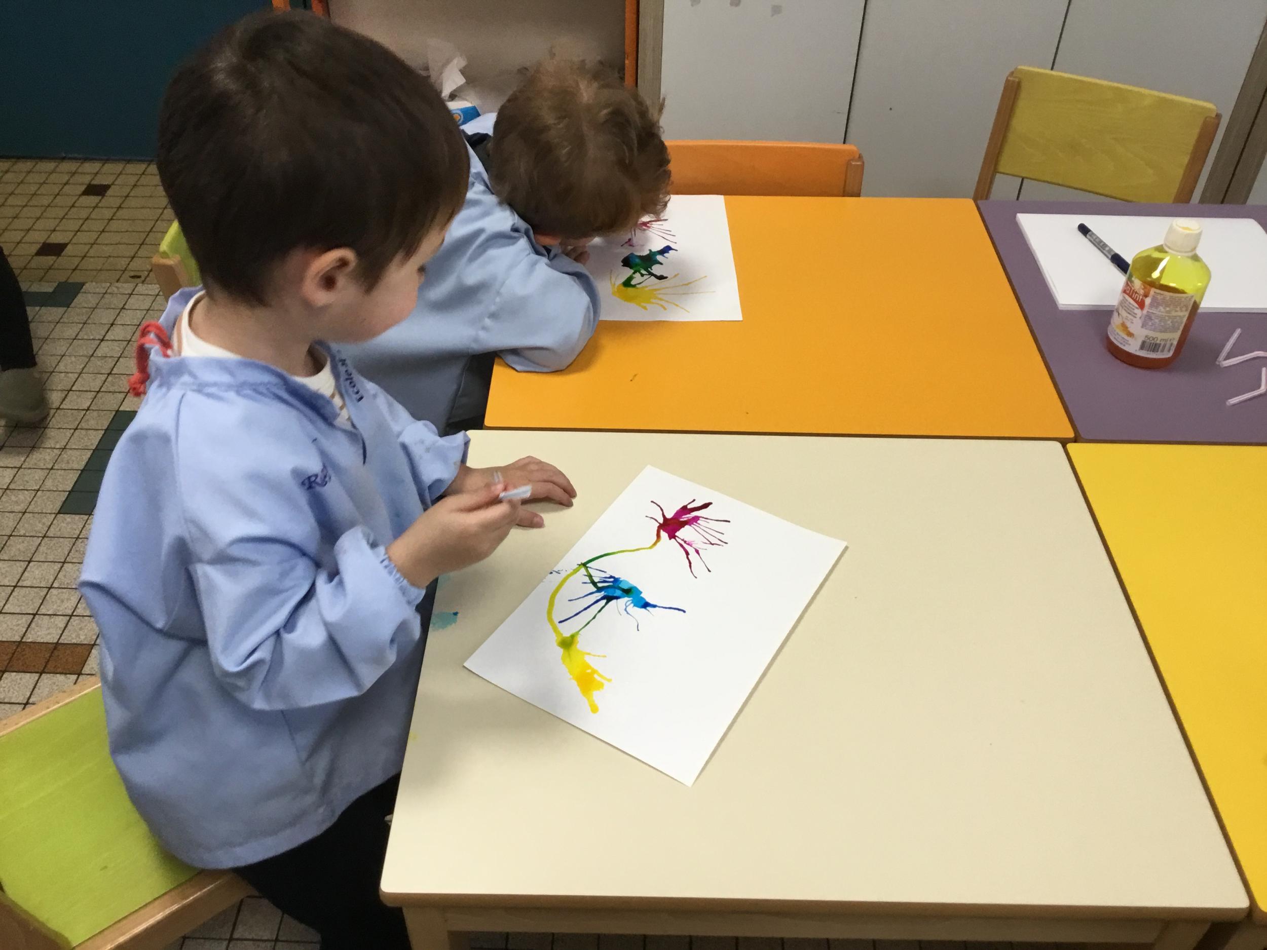 Chaque album a été l’occasion de réaliser une activité plastique. Pour le dernier album lu, « Pas de panique petit crabe », ils ont réalisé des coraux à l’encre de Chine en soufflant dans des pailles. Ce travail est inspiré des illustrations très colorées de cet album.