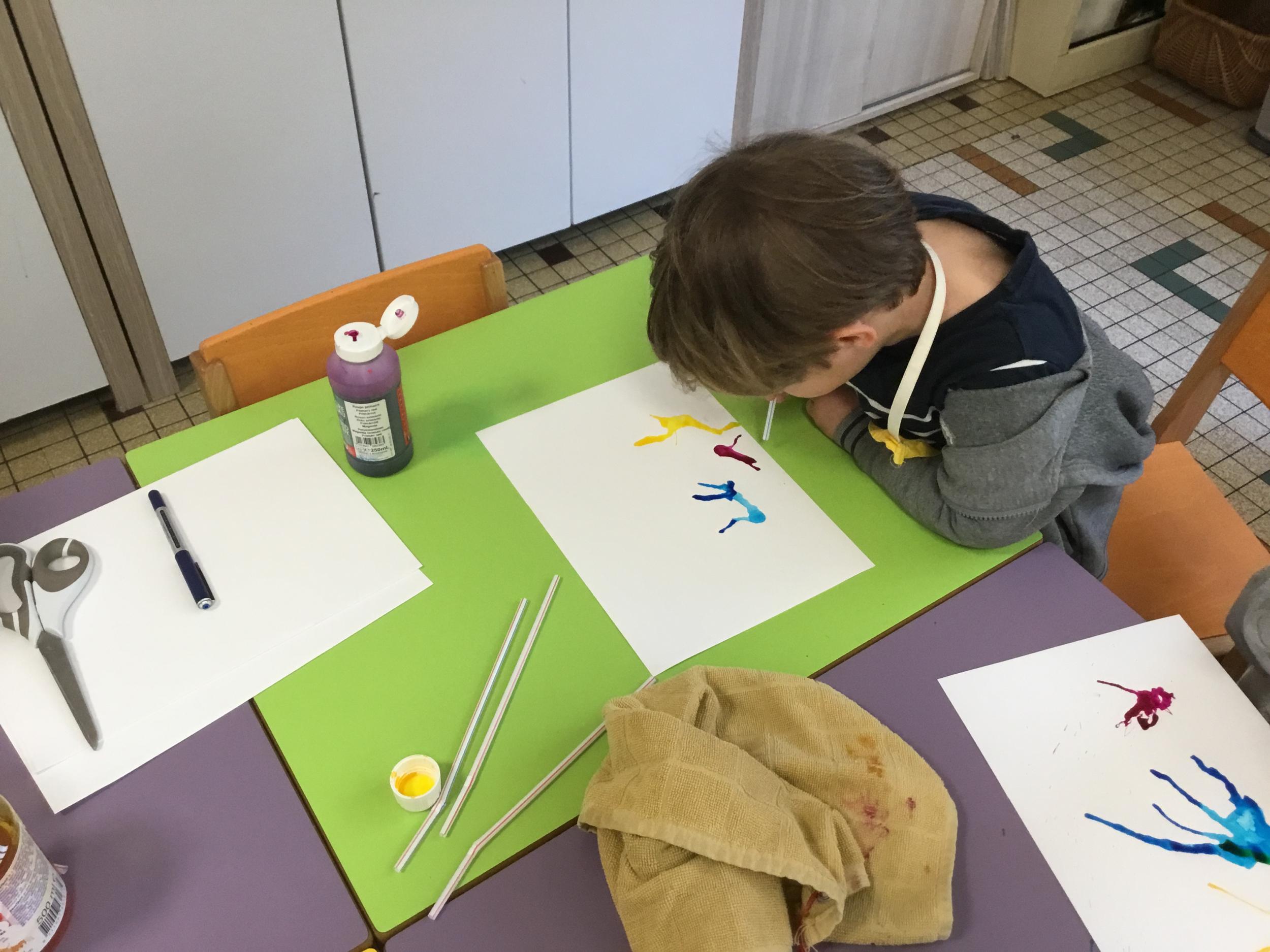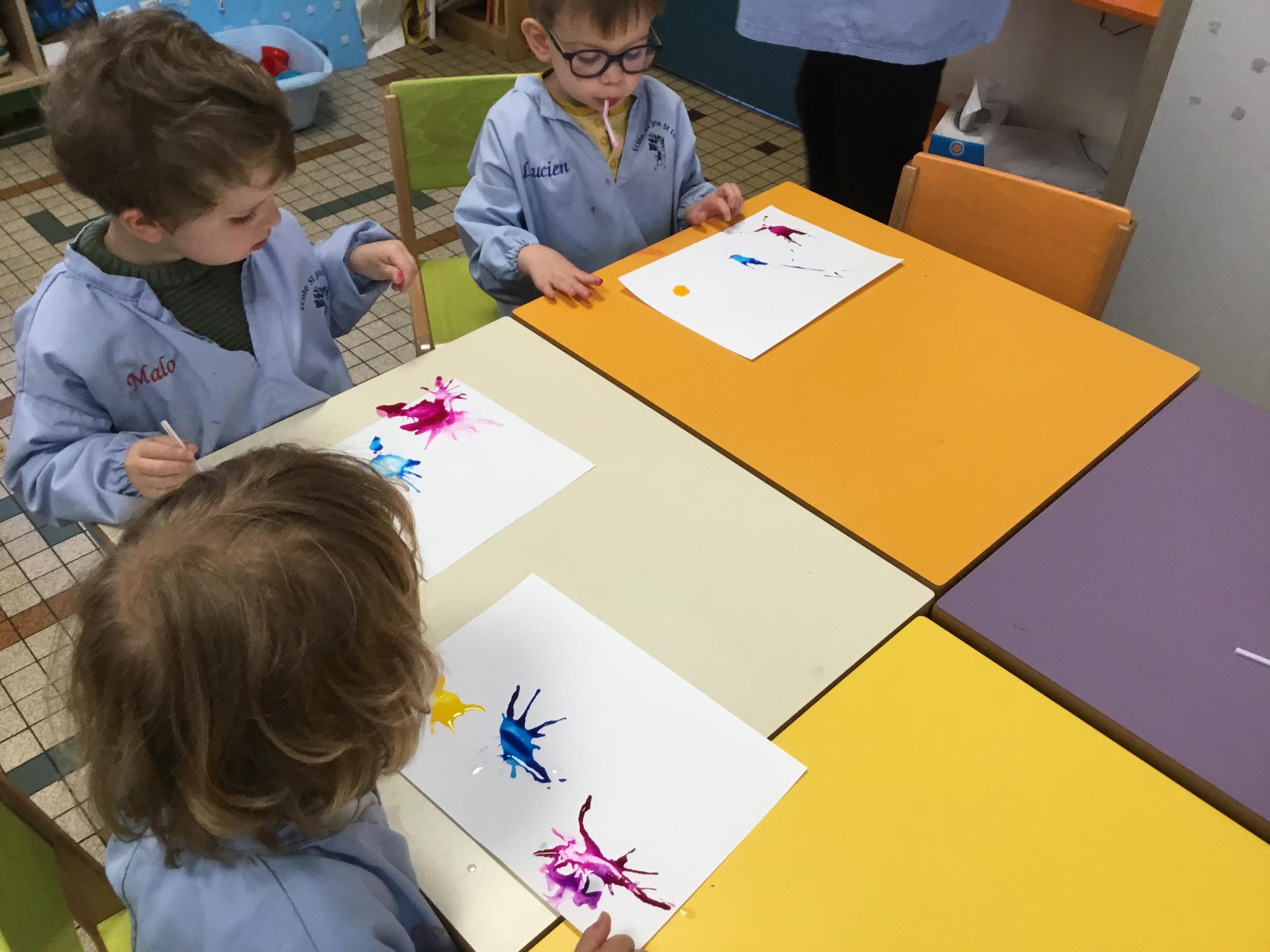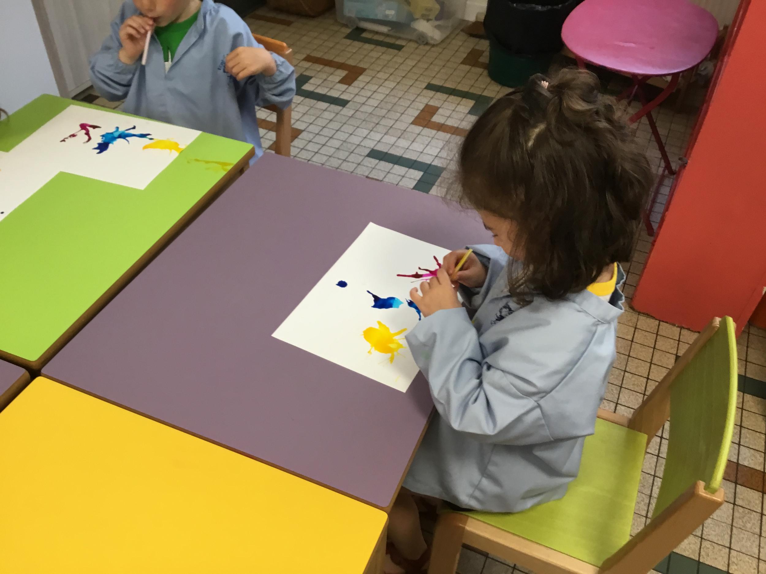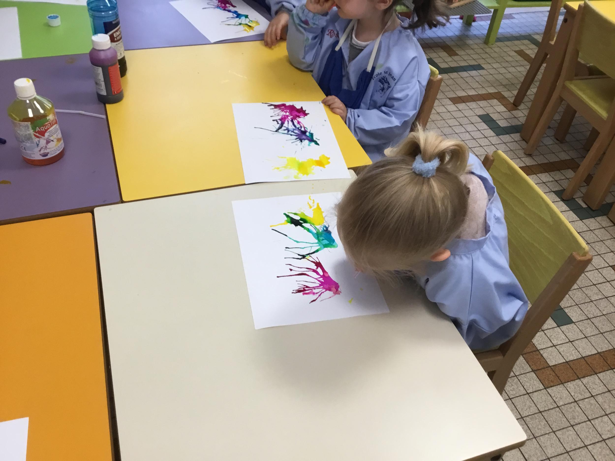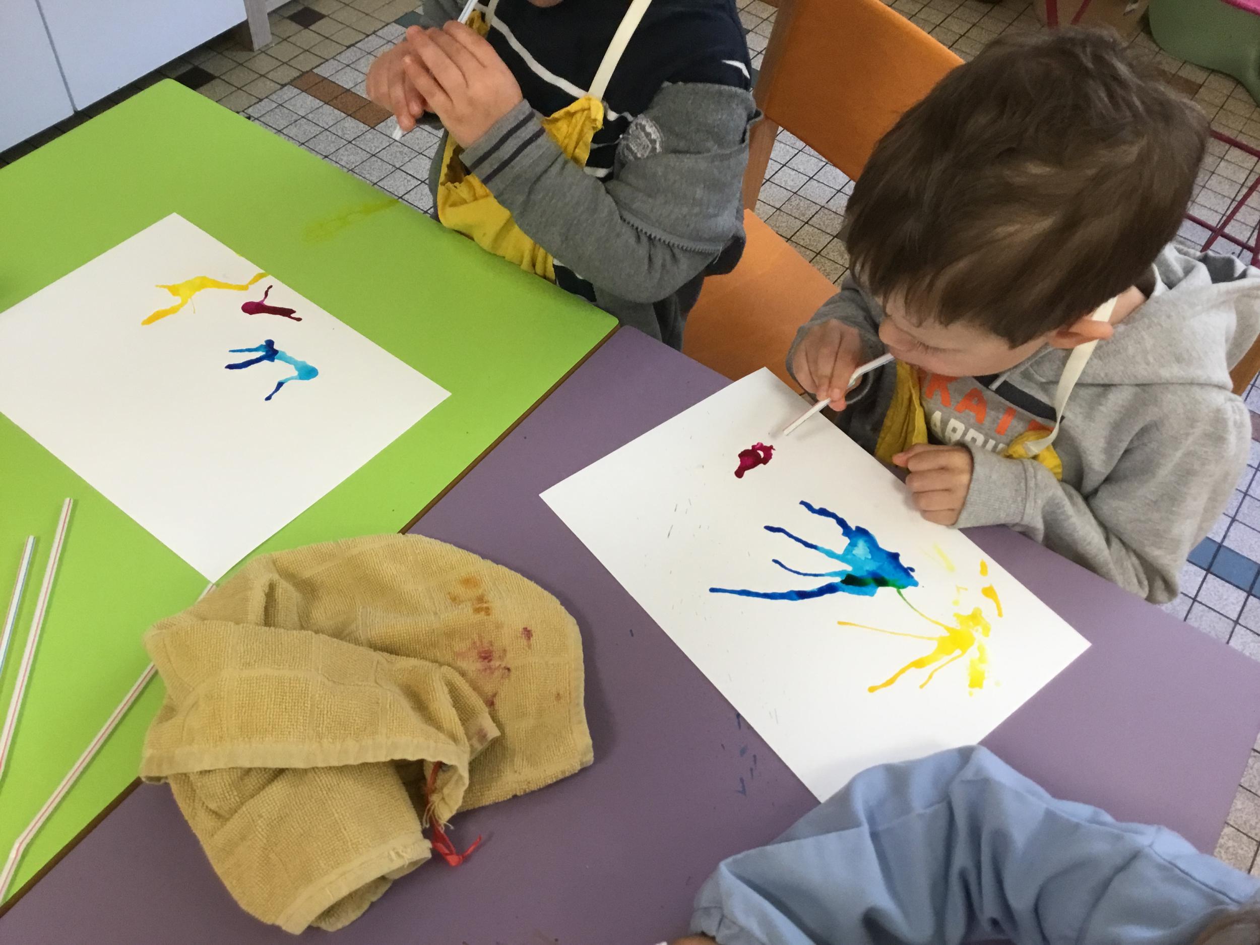 Chaque album a été l’occasion de réaliser une activité plastique. Pour le dernier album lu, « Pas de panique petit crabe », ils ont réalisé des coraux à l’encre de Chine en soufflant dans des pailles. Ce travail est inspiré des illustrations très colorées de cet album.