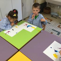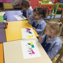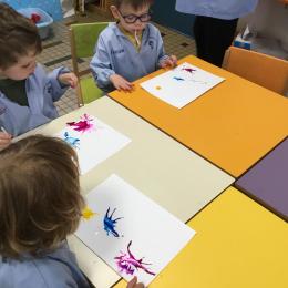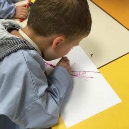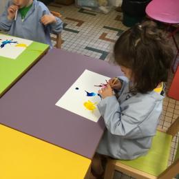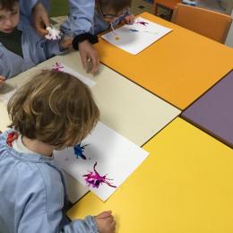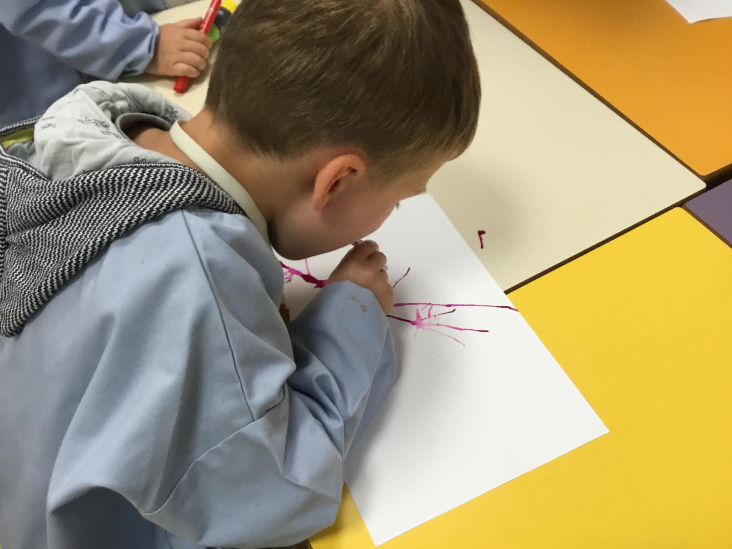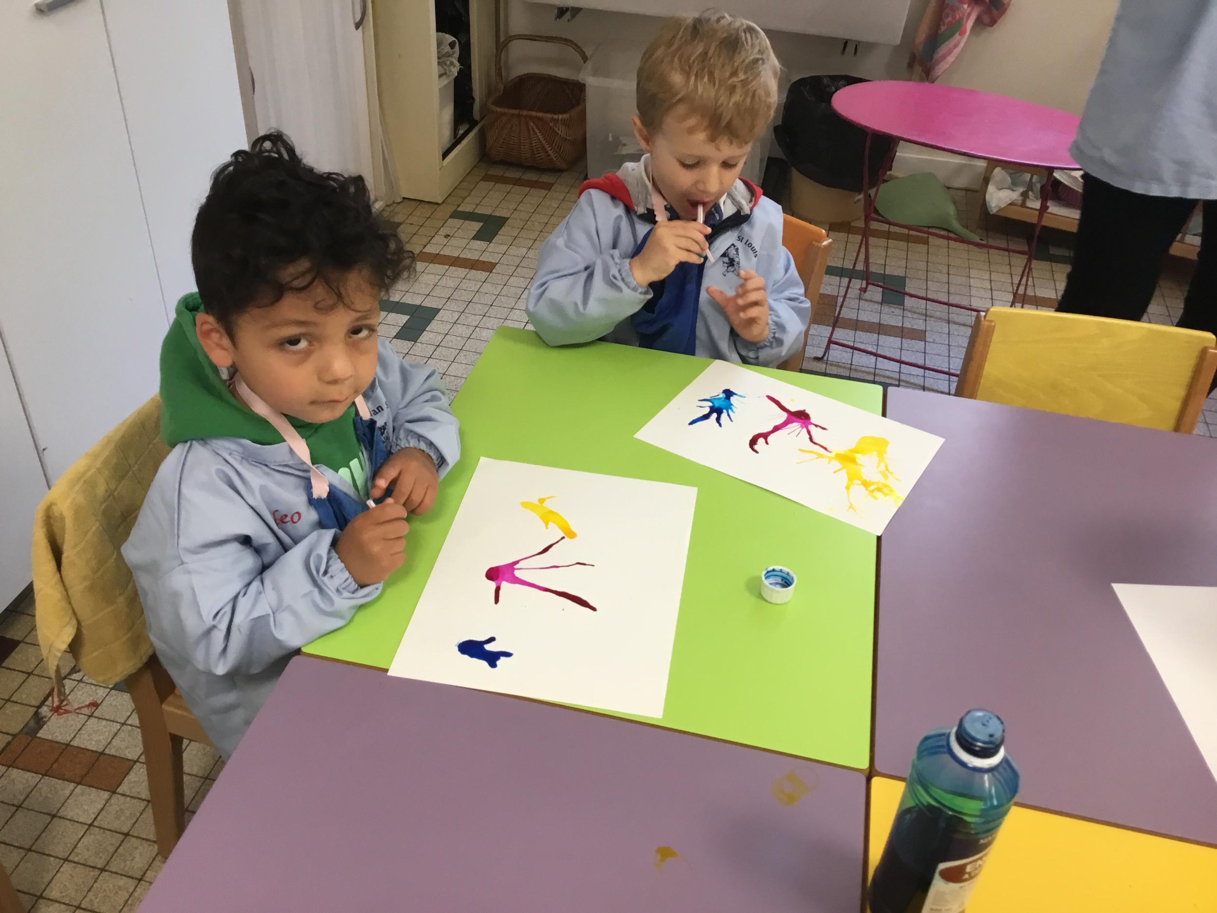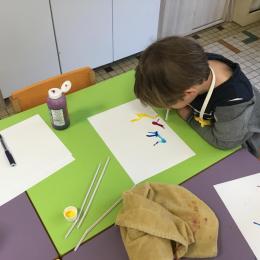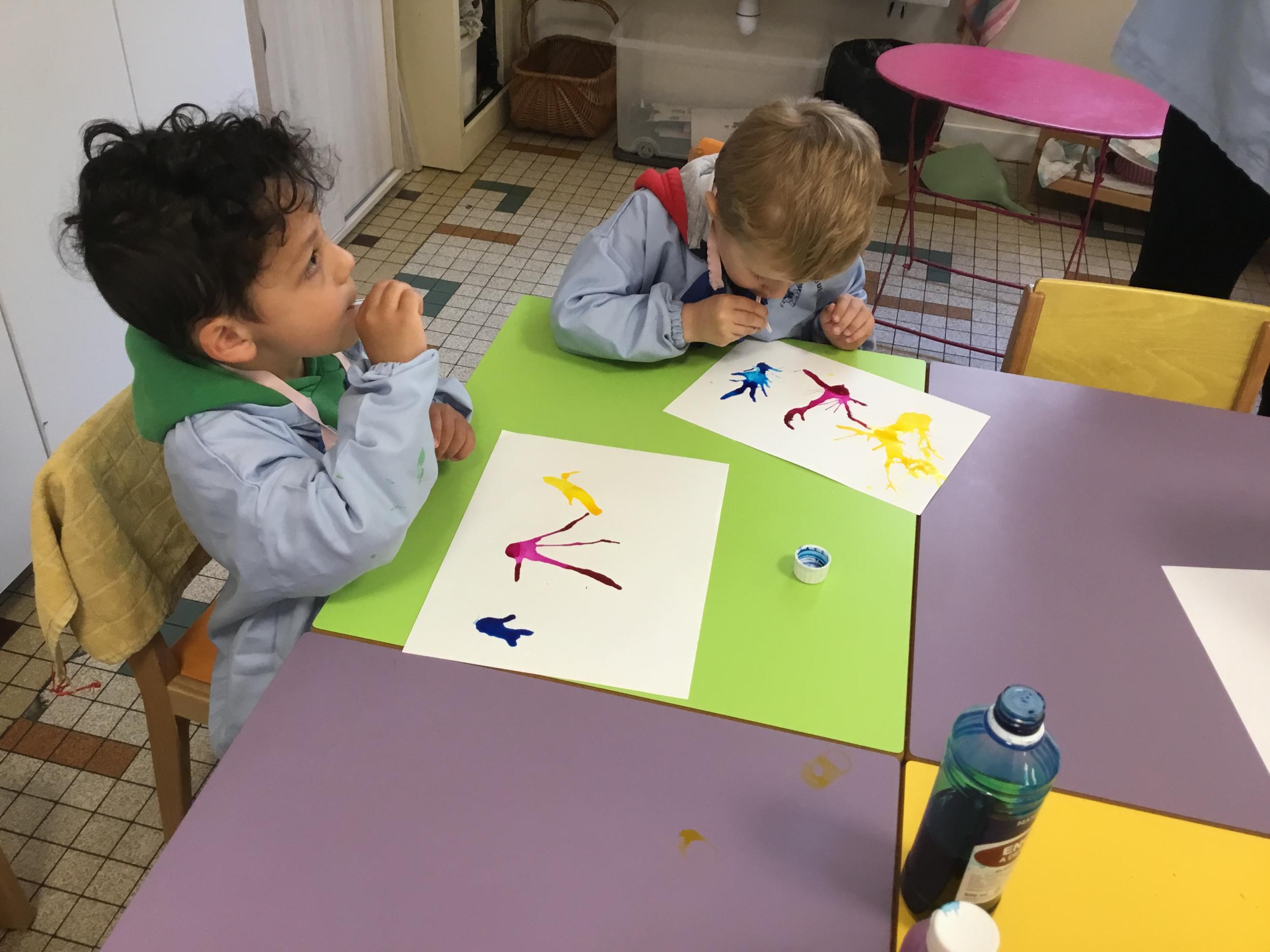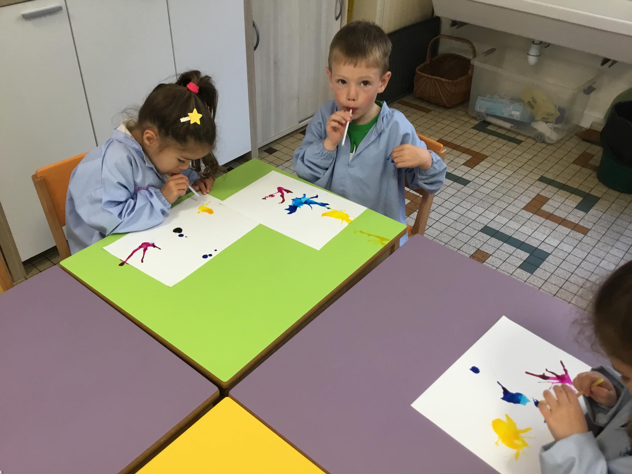 Chaque album a été l’occasion de réaliser une activité plastique. Pour le dernier album lu, « Pas de panique petit crabe », ils ont réalisé des coraux à l’encre de Chine en soufflant dans des pailles. Ce travail est inspiré des illustrations très colorées de cet album.