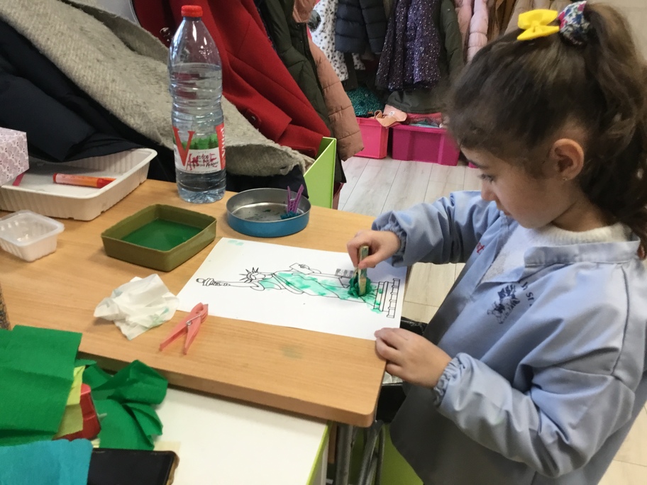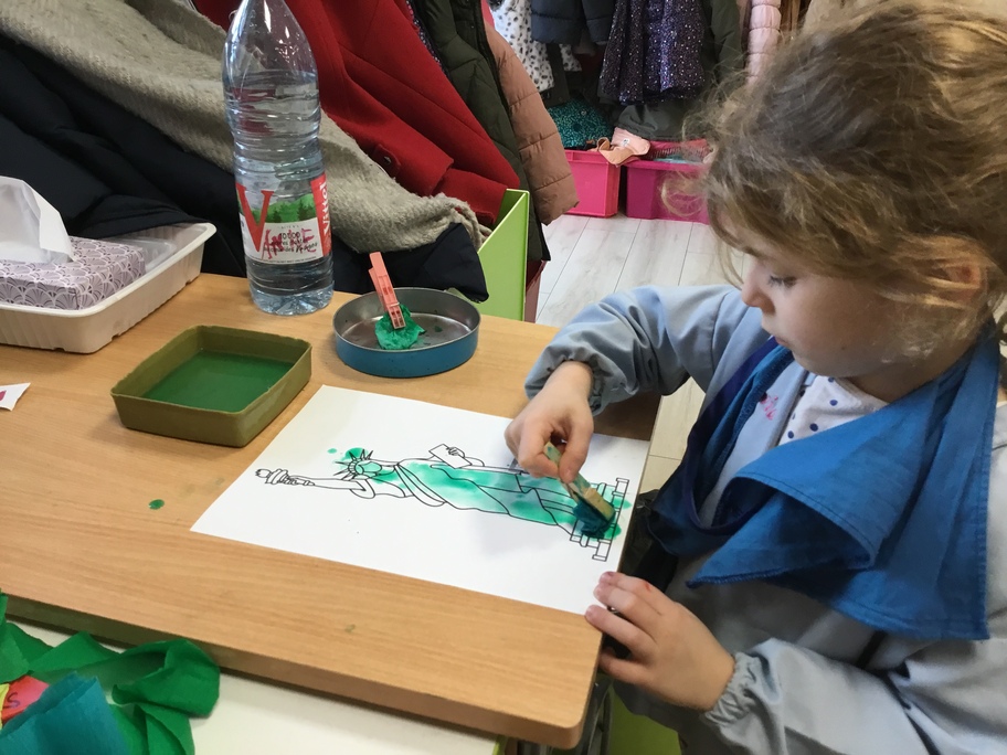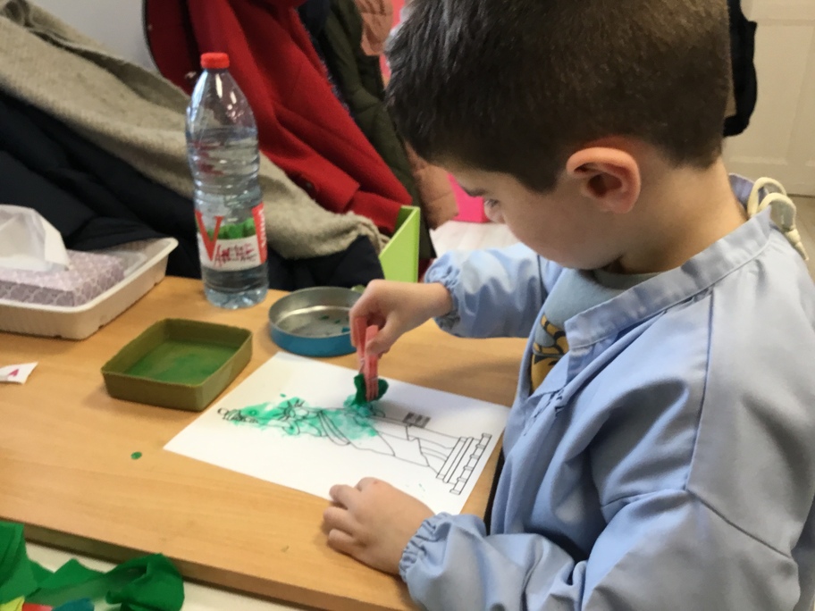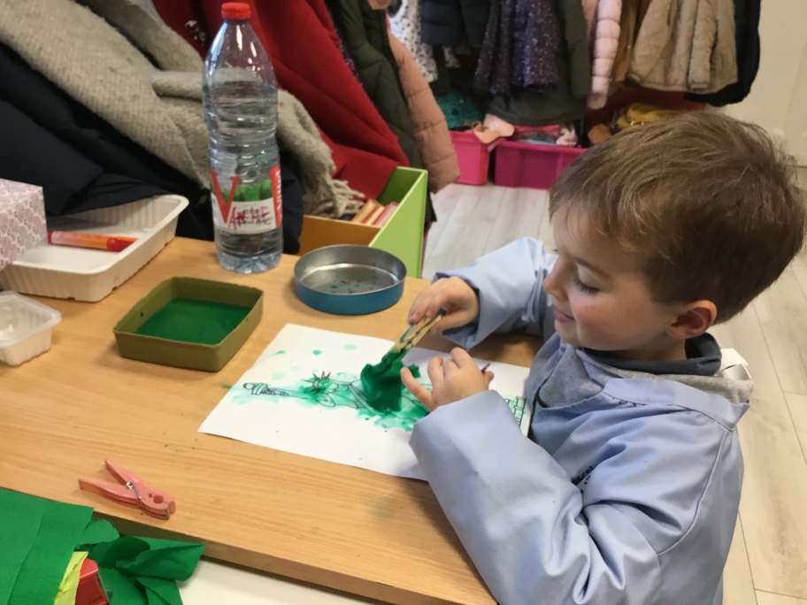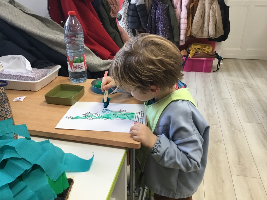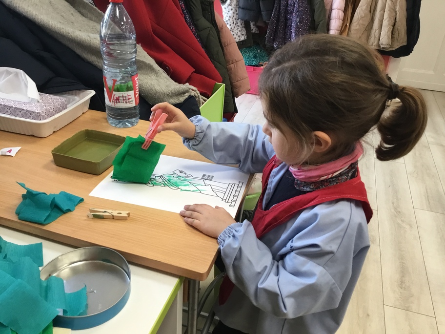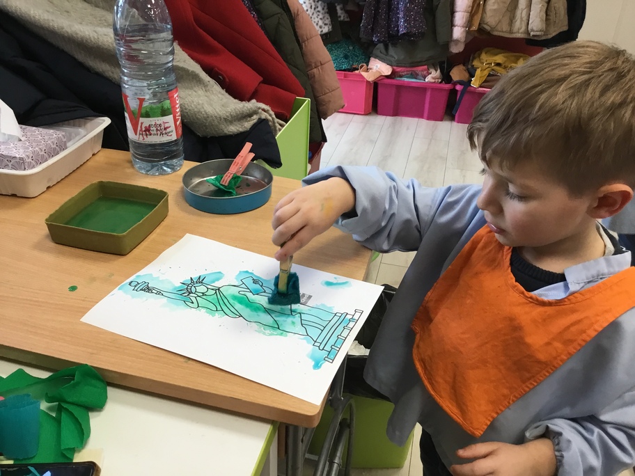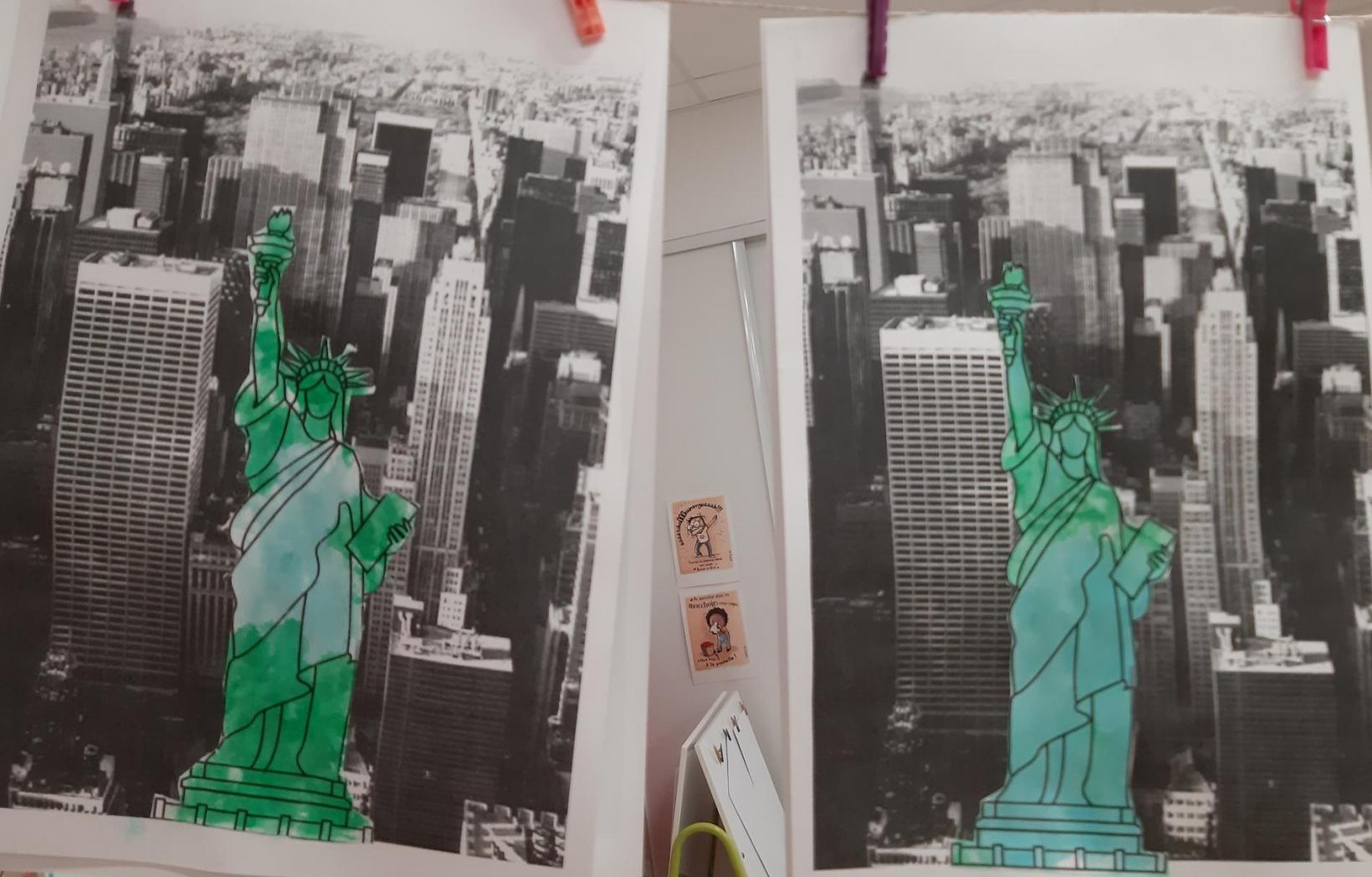 Nous avons donc décoré une statue de la liberté à l'aide de crépon mouillé en tamponnant dessus pour faire dégorger la couleur. Puis, après un découpage minutieux, les élèves ont collé cette illustration sur une grande photo des buildings.